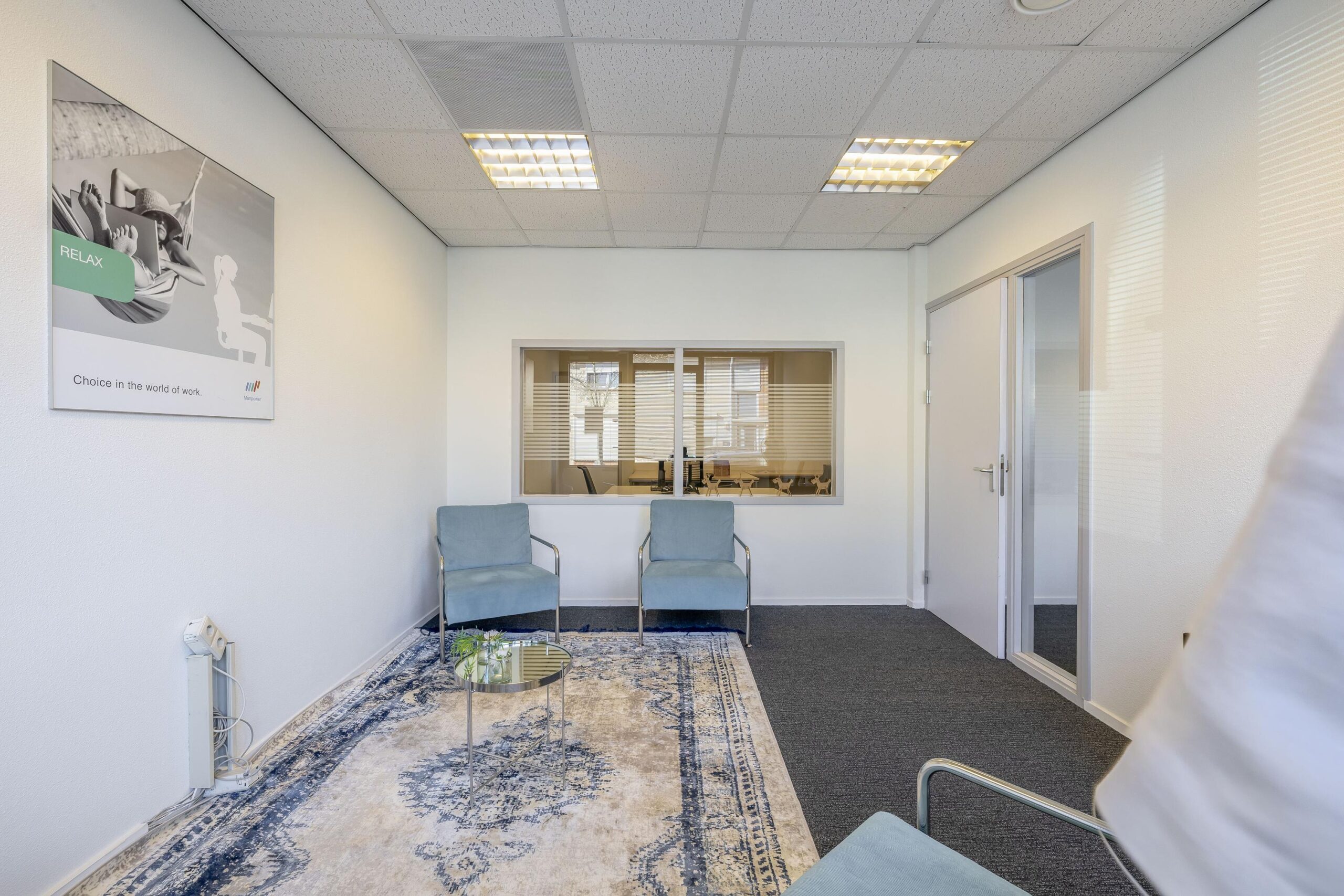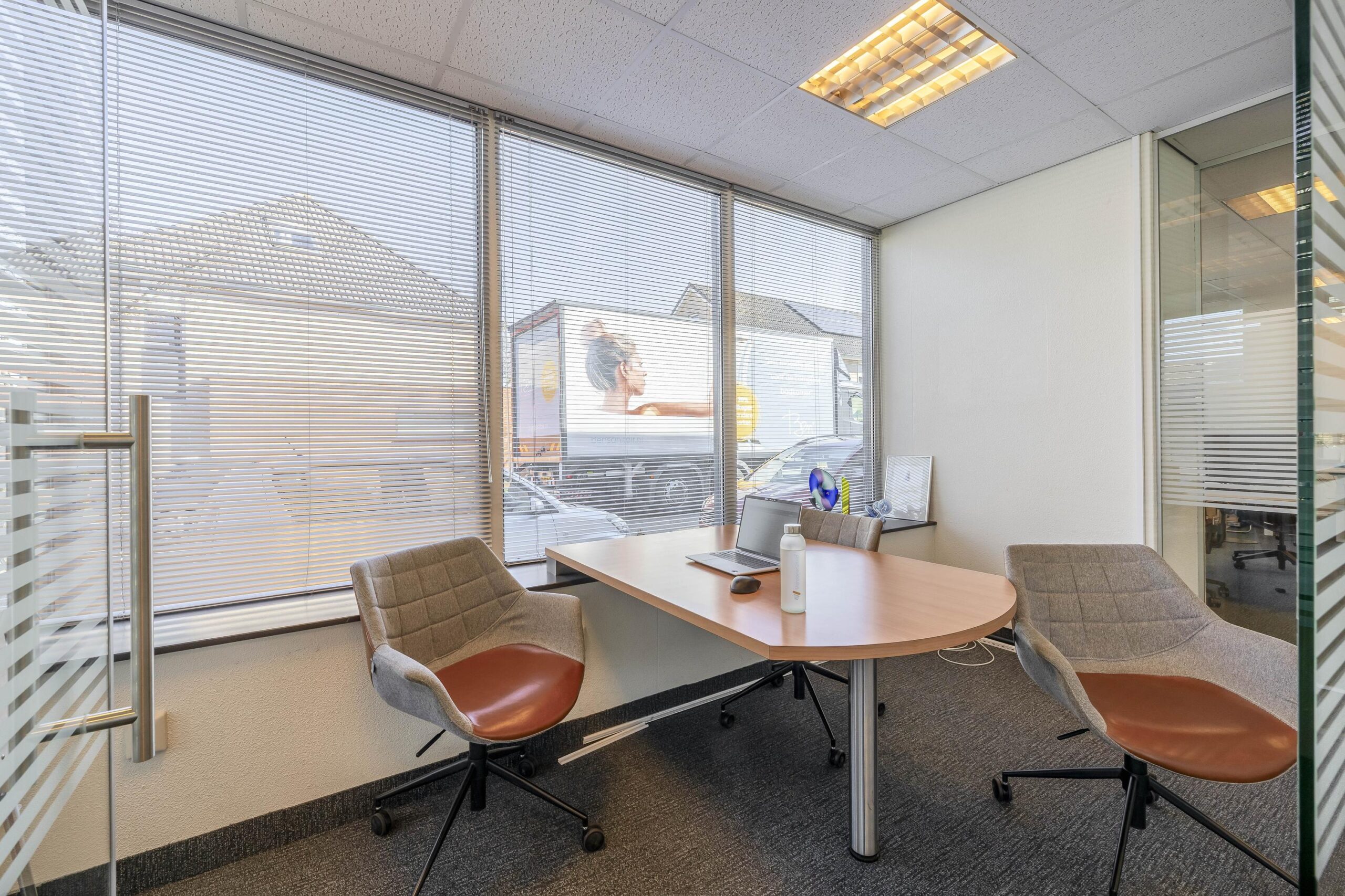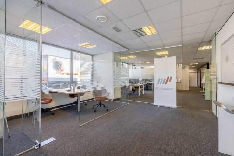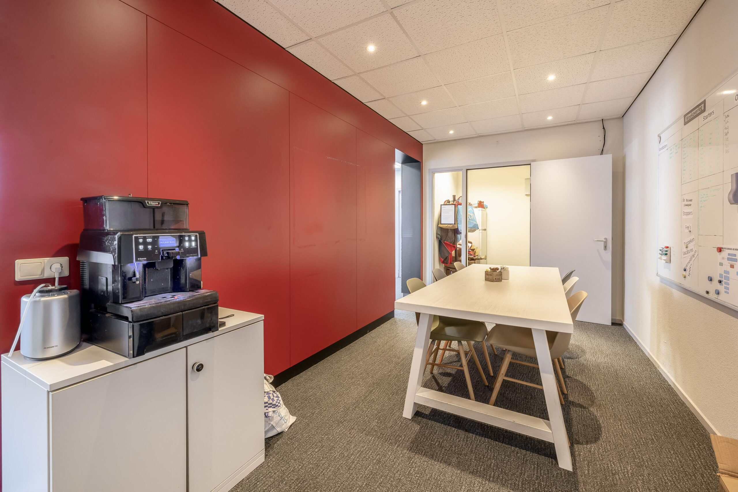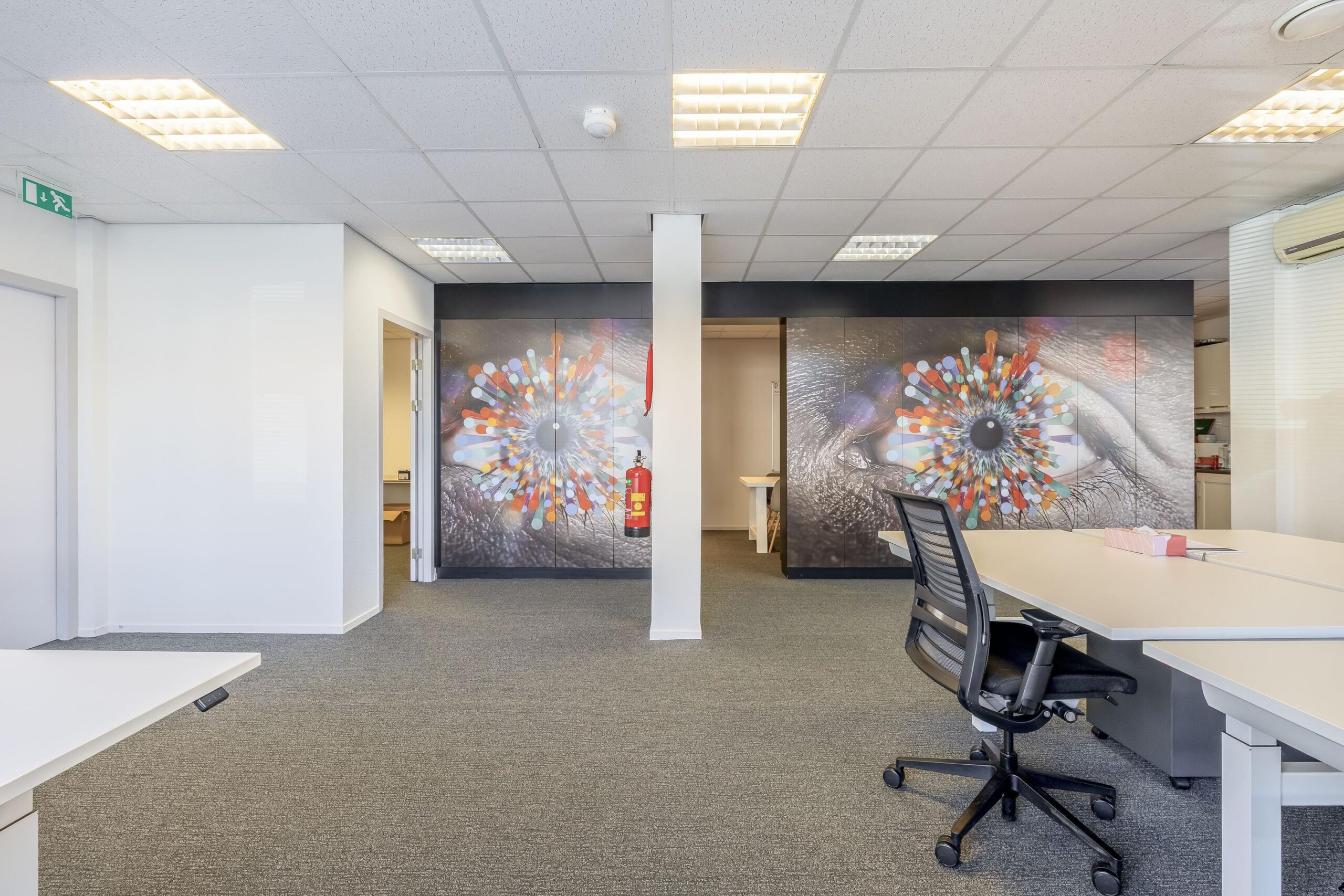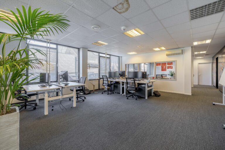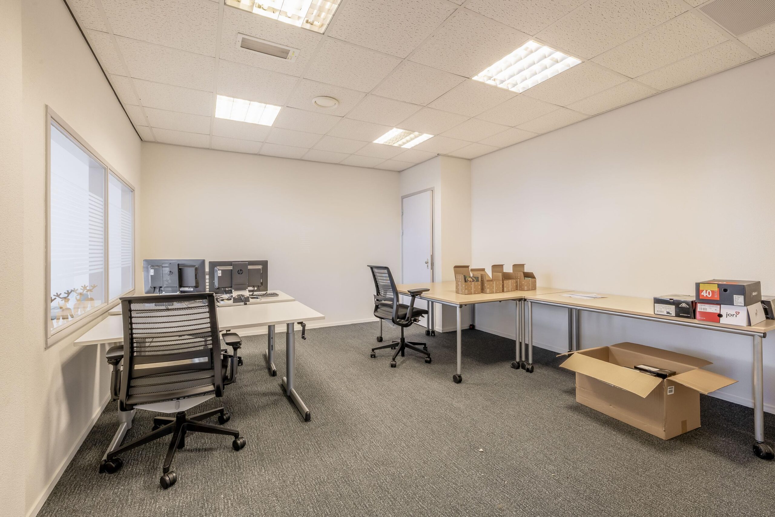 De kantoorruimtes zijn uitgerust met een alarminstallatie, airco-units, verlaagde plafonds met verlichtingsarmaturen. De afgescheiden kantine is uitgerust met een kitchenette.