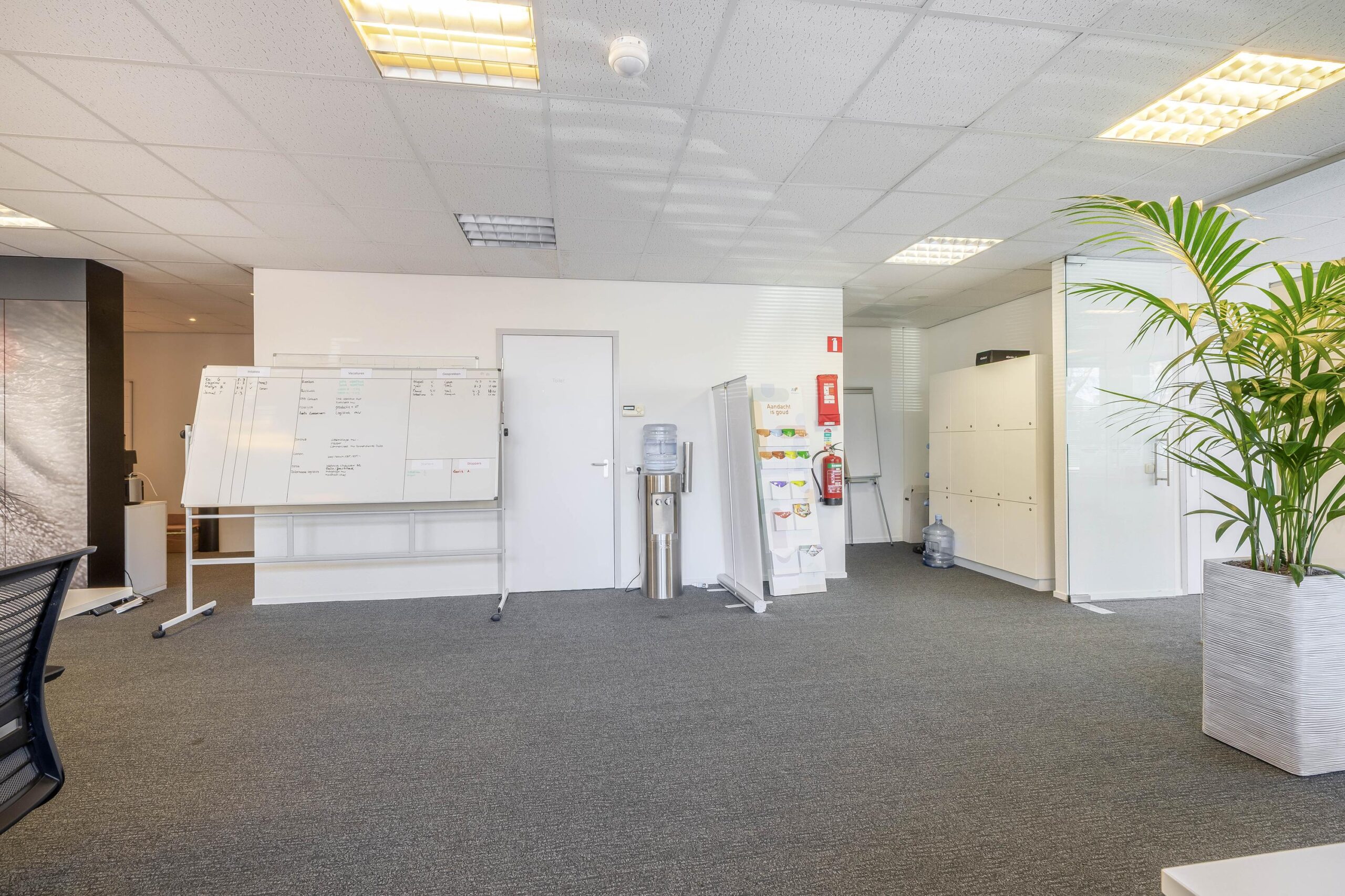 Fraaie entree met spreekkamer afgescheiden d.m.v. een glaswand, vergaderruimte, kantoortuin, afgescheiden kantine met koffiecorner en toiletten, kopieerruimte, 2 kantoorruimtes annex spreekkamers.