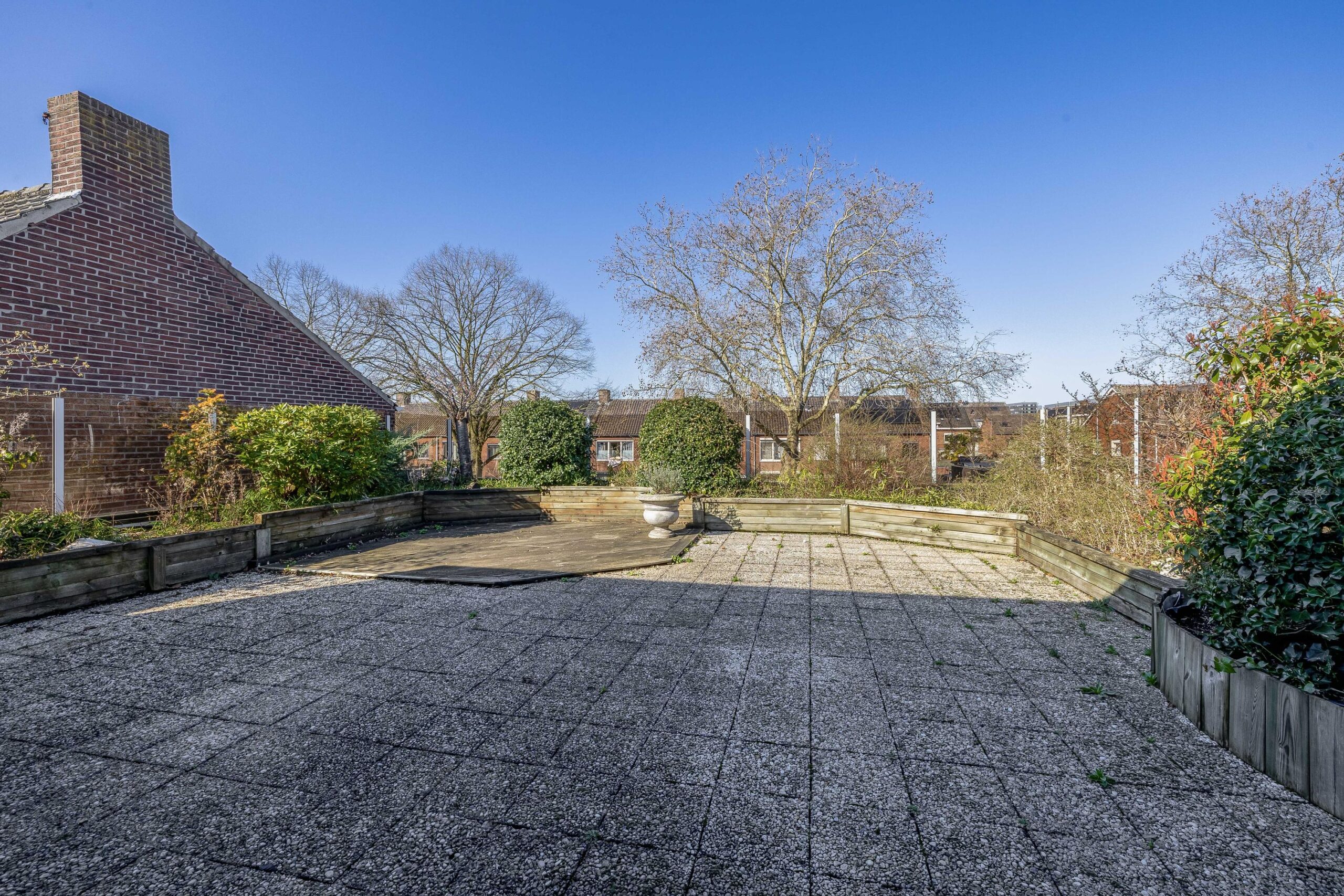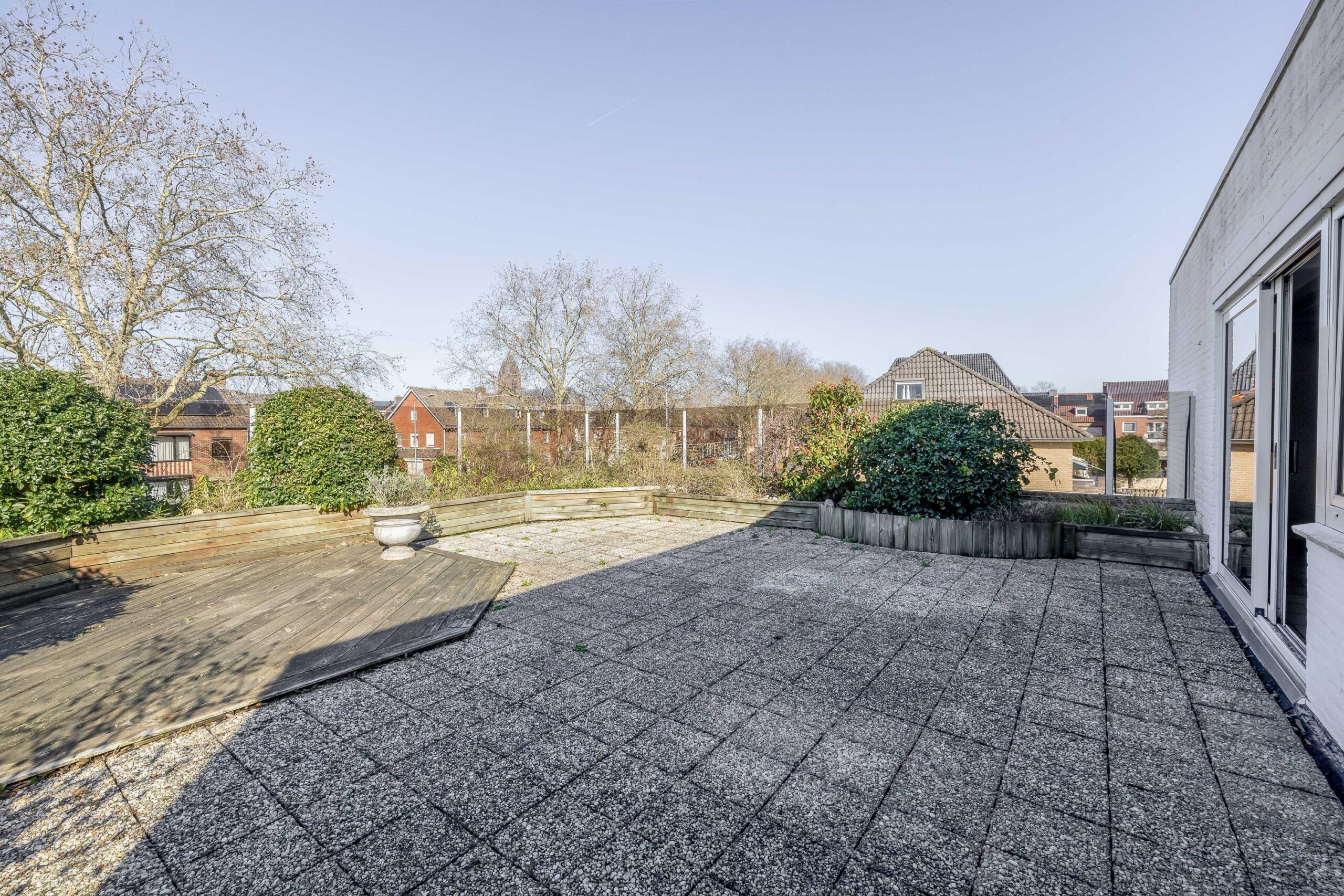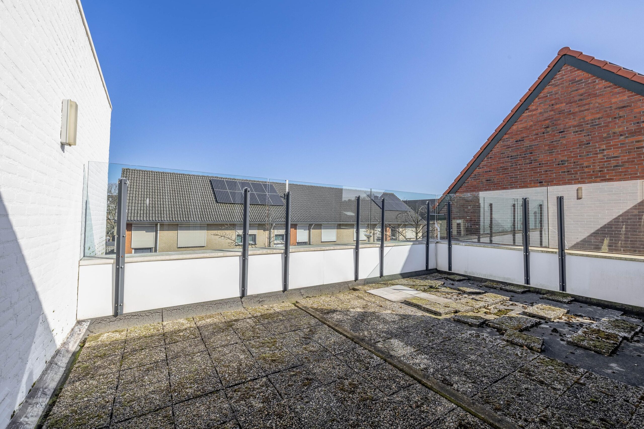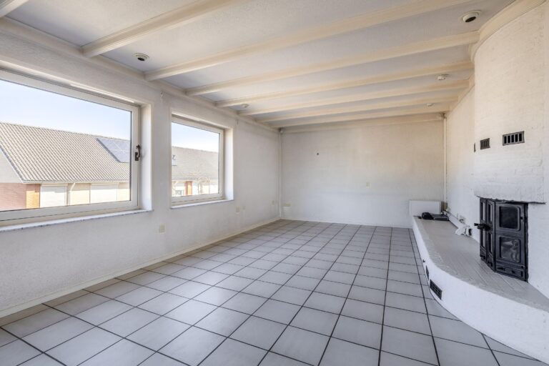De ruime woonkamer valt direct op door de grote hoeveelheid natuurlijk licht. Dankzij de vloerverwarming en de sfeervolle open haard is het hier het hele jaar door aangenaam vertoeven. Via de schuifdeur in de keuken stap je zo het dakterras op. Met een oppervlakte van circa 68 m² en volop privacy is dit de perfecte plek om te ontspannen of gezellig te genieten met familie en vrienden.