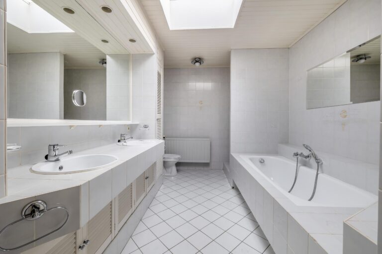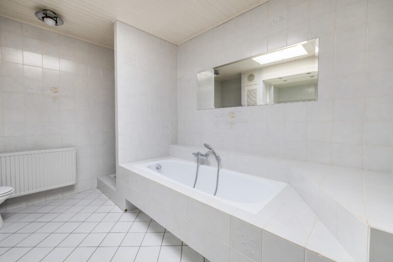 De ruime badkamer is compleet uitgerust met een ligbad, aparte douche, dubbele wastafel met meubel, verwarming en een tweede toilet.