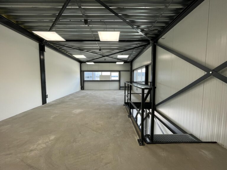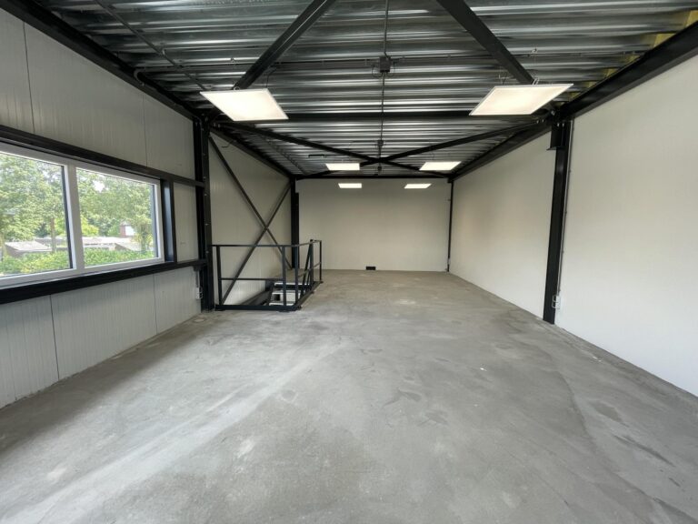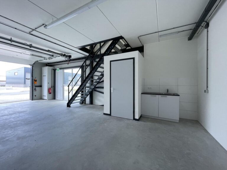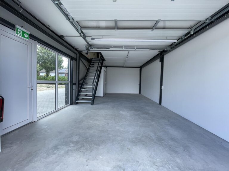 De bedrijfsruimte is in 2023 gerealiseerd en opgetrokken uit een staalconstructie. De vrije hoogte bedraagt 2,64 m¹. De bedrijfsruimte bestaat uit een opslagruimte van circa 50 m² v.v.o. op de begane grond, te betreden via de loopdeur aan de zijkant. De voorzijde is voorzien van een elektrische bedienbare overheaddeur. De bedrijfsruimte is voorzien van een betonnen verdiepingsvloer bereikbaar via de stalen trap. Onder de stalen trap zijn een half betegeld toilet en keukenblok met elektrische boiler gesitueerd. Middels de degelijke stalen trap is de eerste verdieping van circa 50 m² v.v.o. bereikbaar. De verdieping is voorzien van LED-armaturen, diverse wandcontactdozen en een aansluitpunt voor WIFI.
