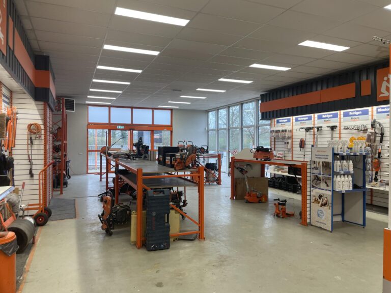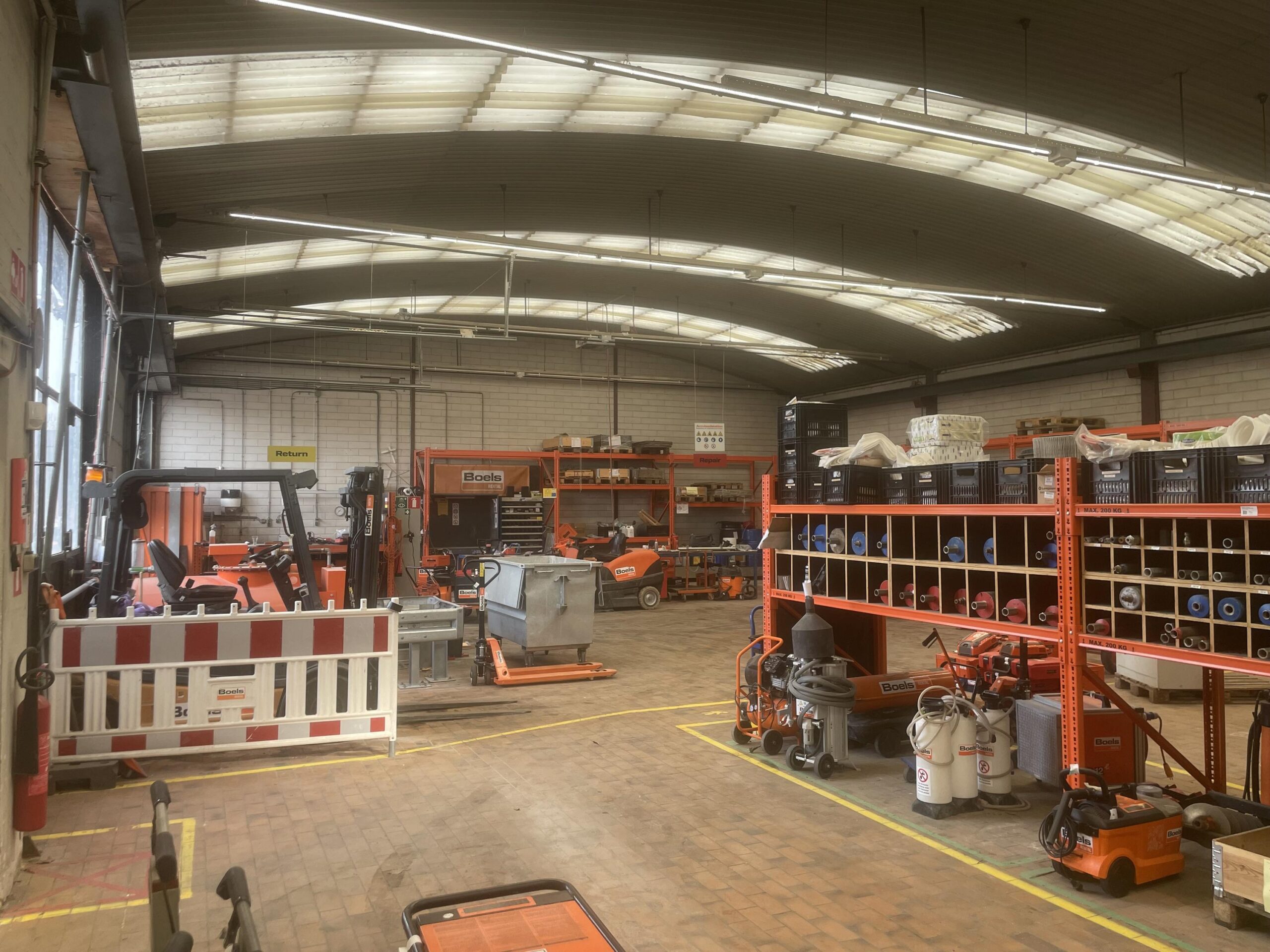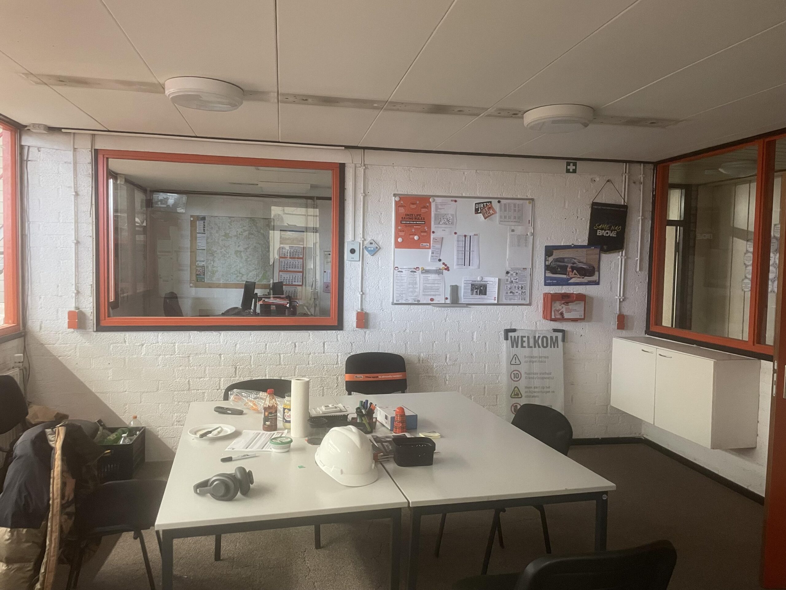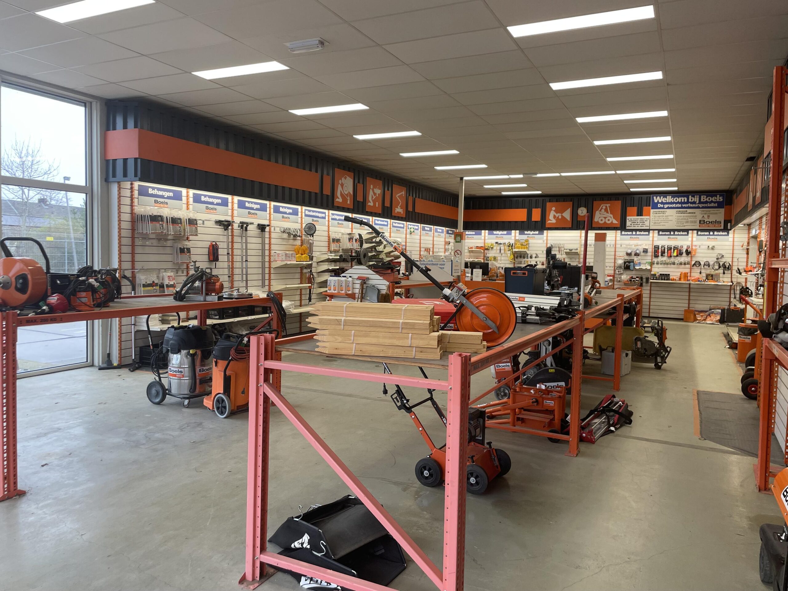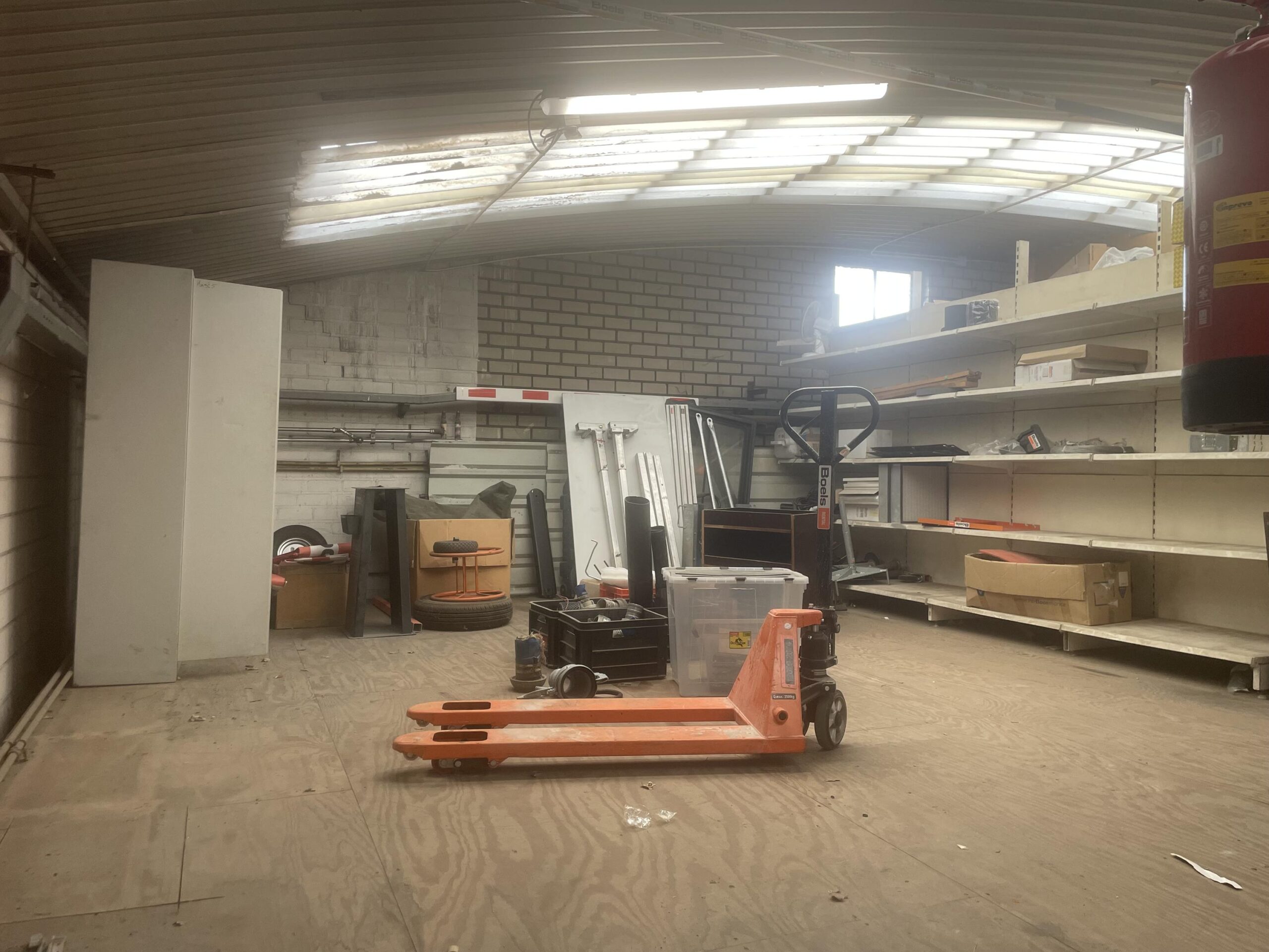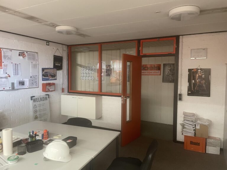 Parkeerterrein, entree, showroom (ca. 150 m2), opslag-/werkplaats met kantoorruimte, keuken, toiletruimte (totaal ca. 375 m2) en verdieping (ca. 75 m2). Buitenterrein.