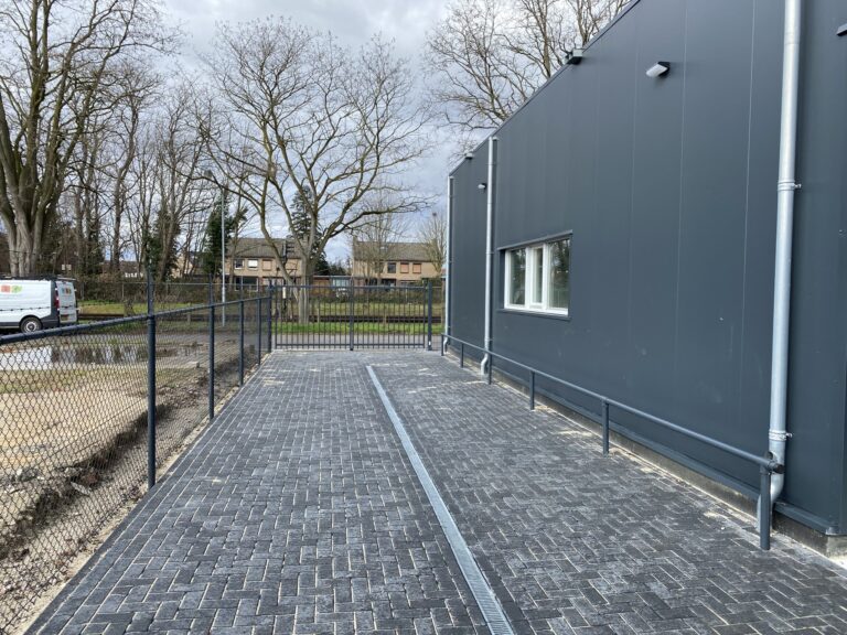 Het buitenterrein is geheeld beklinkerd en omheind met toegang middels een elektrische poort (doorgang 4,5 m¹).
