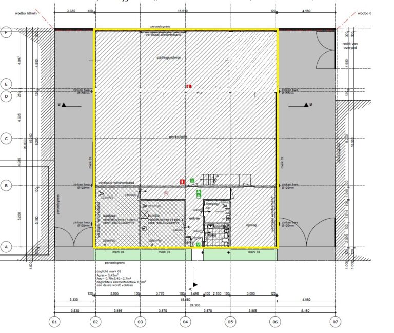 Het object is opgetrokken uit een staalconstructie met gevels uit sandwichpanelen met hardhouten kozijnen en trippel gelaagd dubbel glas, stalen geprofileerde dakplaten afgewerkt met een bitumineuze dakbedekking en een monolithische vloer. Het object is volledig geïsoleerd. Inpandig zijn een kantoor van circa 20 m², kantine met pantry, aparte opslag, toiletgroep en een aparte berging. De hal beschikt aan beiden zijgevels over overheadpoorten waarvan 1 handmatig bedienbaar en 1 elektrisch. De hal wordt verwarmd middels een gas heater. De kantoorruimten worden verwarmd middels elektrische heaters. Bovenop de kantoorruimte is een verdiepingsvloer/zolder (1,80 m¹ hoog) circa 81 m² groot, bereikbaar middels een vaste trap in de hal.