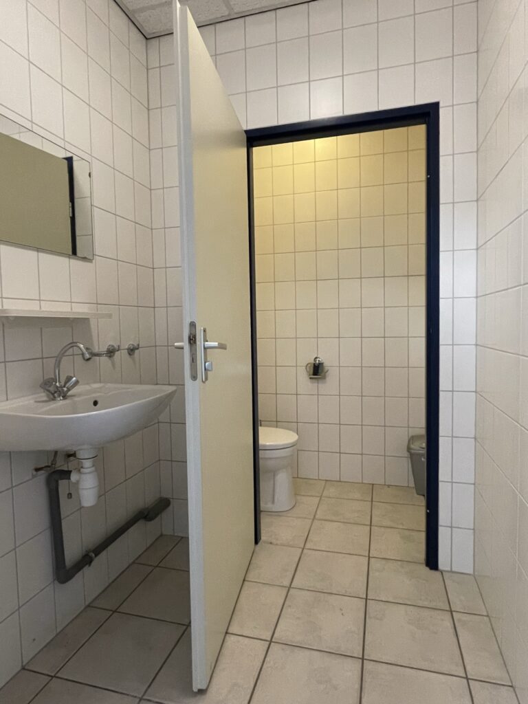 Entree/ontvangstruimte met toegang tot geheel betegeld toiletruimtes – trapopgang naar 1e verdieping – showroom (ca. 16 m²) v.v. airconditioning – opslagruimte (ca. 18 m²).