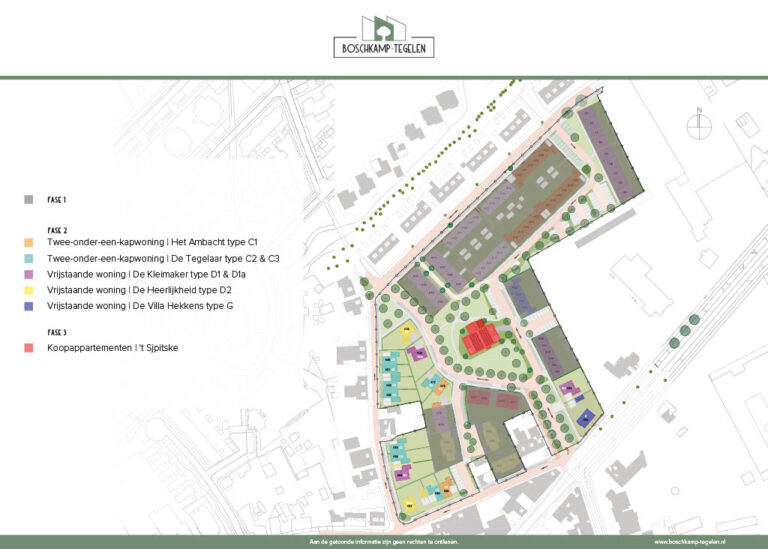 De 16 grondgebonden woningen in fase 2 bestaan uit 10 twee-onder-een-kapwoningen en 6 vrijstaande woningen. De charmante twee-onder-een-kapwoningen worden verdeeld in twee verschillende types: De Tegelaar (type C2 en C3) en Het Ambacht (type C1). De royale vrijstaande woningen worden ook verdeeld in verschillende types waaronder De Kleimaker (type D1), De Heerlijkheid (type D2) en de prachtige Villa Hekkens (type G).