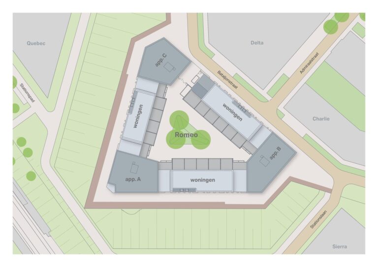Op de drie hoeken van Romeo bevinden zich de appartementencomplexen. De 21 appartementen bieden een stijlvolle mix van comfort, elegantie en duurzaamheid. Elk appartement biedt een prachtig uitzicht op de omgeving en een plek waar je je meteen thuis voelt. Voeg daar de ideale ligging in het levendige Kazernekwartier aan toe, en je hebt de perfecte combinatie van gemak en dynamiek.