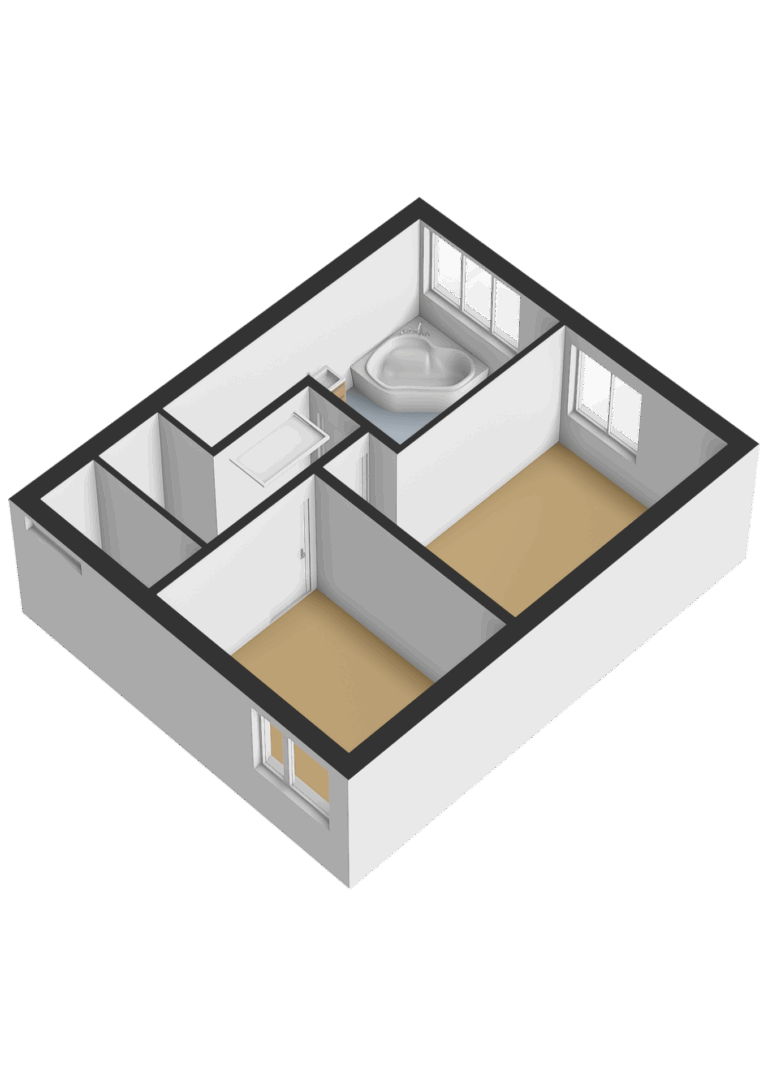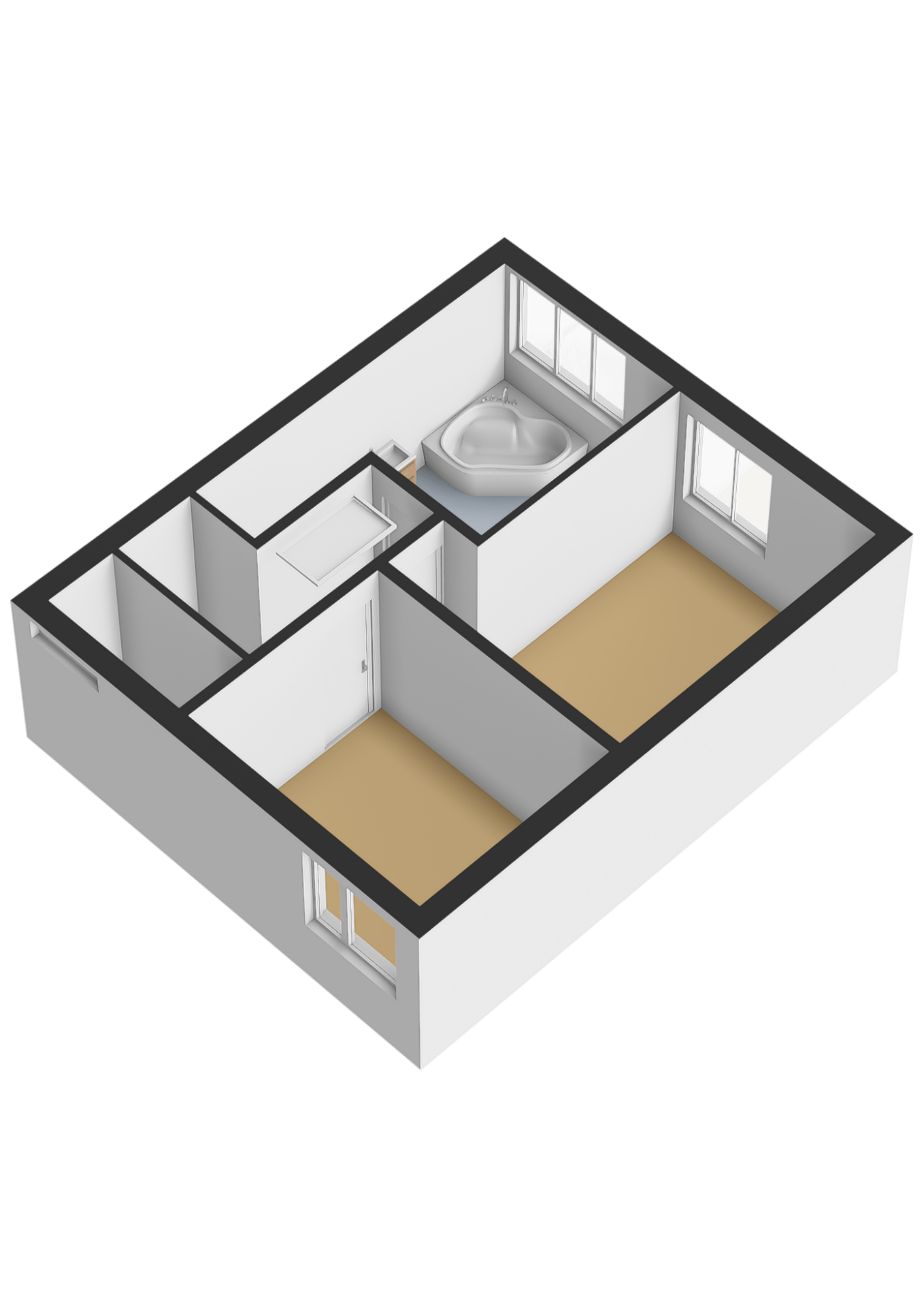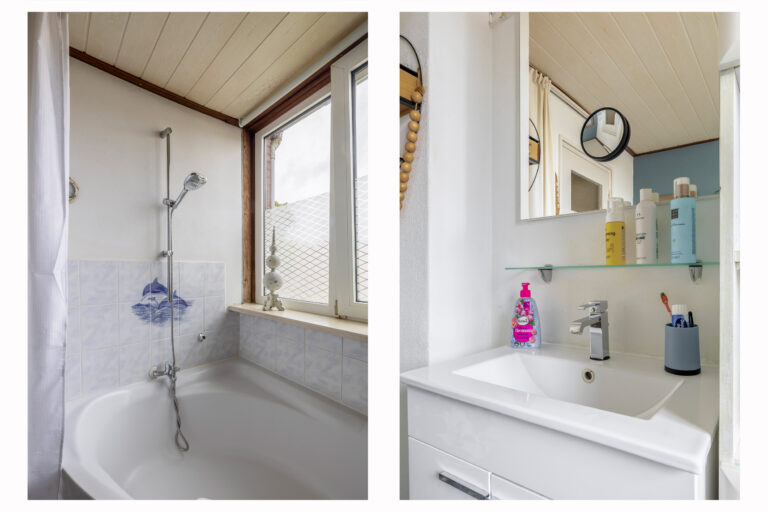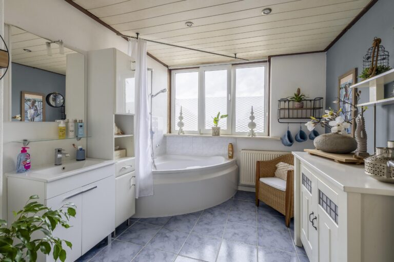 Op de eerste verdieping bevinden zich twee ruime slaapkamers met laminaatvloeren en een grote badkamer. De badkamer is uitgerust met een hoekbad, aparte douche en een modern wastafelmeubel, een plek om heerlijk te ontspannen na een lange dag.
