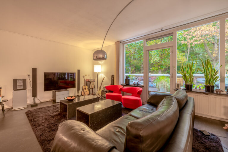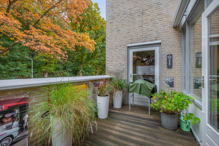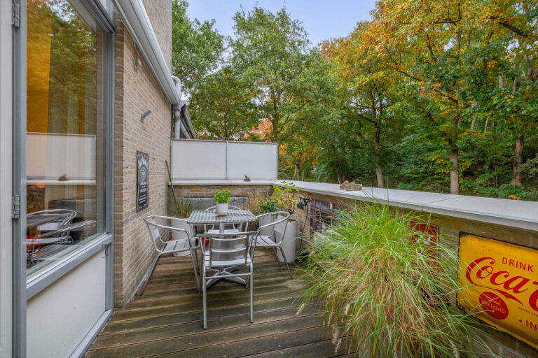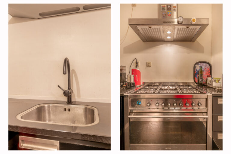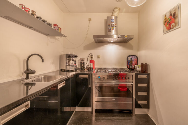 De grote en lichte woonkamer biedt direct toegang tot het balkon. Vanuit het balkon is er een mooi uitzicht op het aanwezige groen. Er is een elektrisch zonnescherm aanwezig. In de halfopen keuken zijn een 6-pits gasfornuis, afzuigkap, grote oven en koelkast aanwezig. De keuken is afgewerkt met een granieten aanrechtblad.