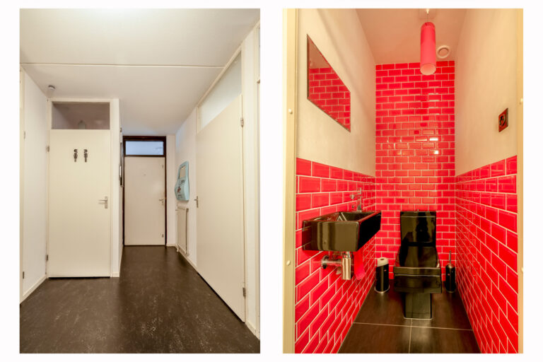 De ruimte entree is voorzien van het toilet met fonteintje en de berging/wasruimte met de witgoedaansluiting.