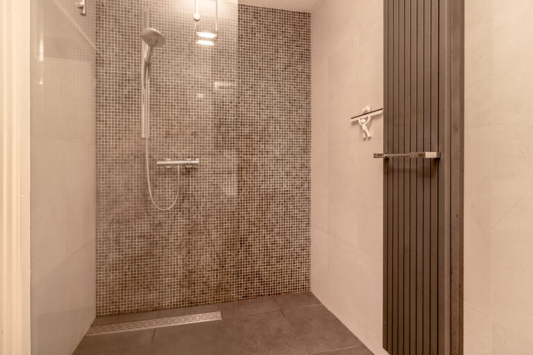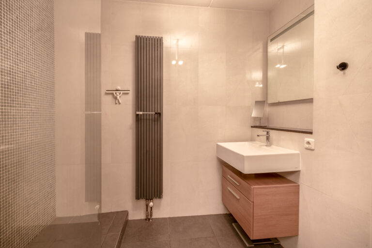 In de badkamer zijn een inloopdouche, wastafelmeubel en designradiator aanwezig.