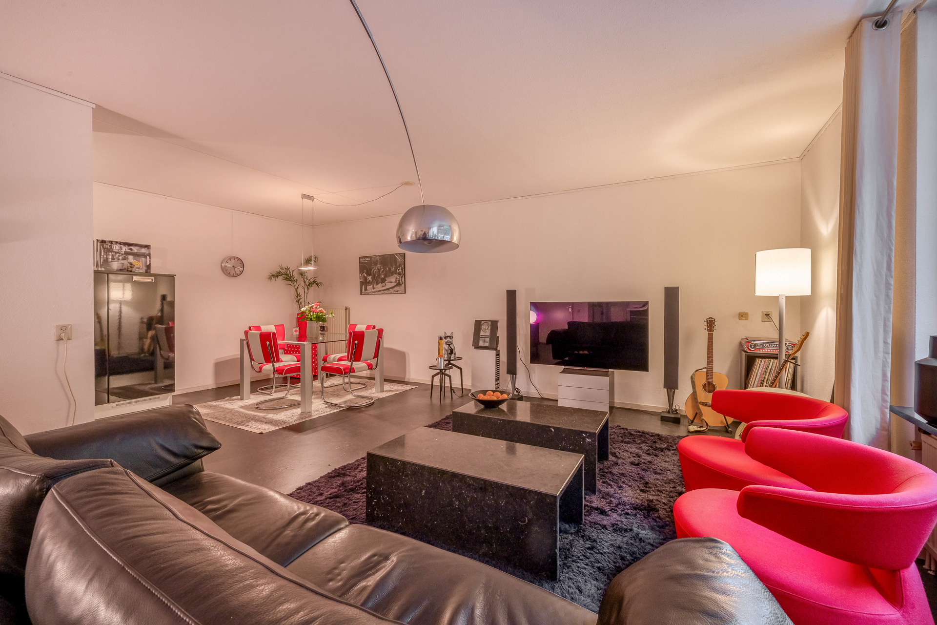 De grote en lichte woonkamer biedt direct toegang tot het balkon. Vanuit het balkon is er een mooi uitzicht op het aanwezige groen. Er is een elektrisch zonnescherm aanwezig. In de halfopen keuken zijn een 6-pits gasfornuis, afzuigkap, grote oven en koelkast aanwezig. De keuken is afgewerkt met een granieten aanrechtblad.