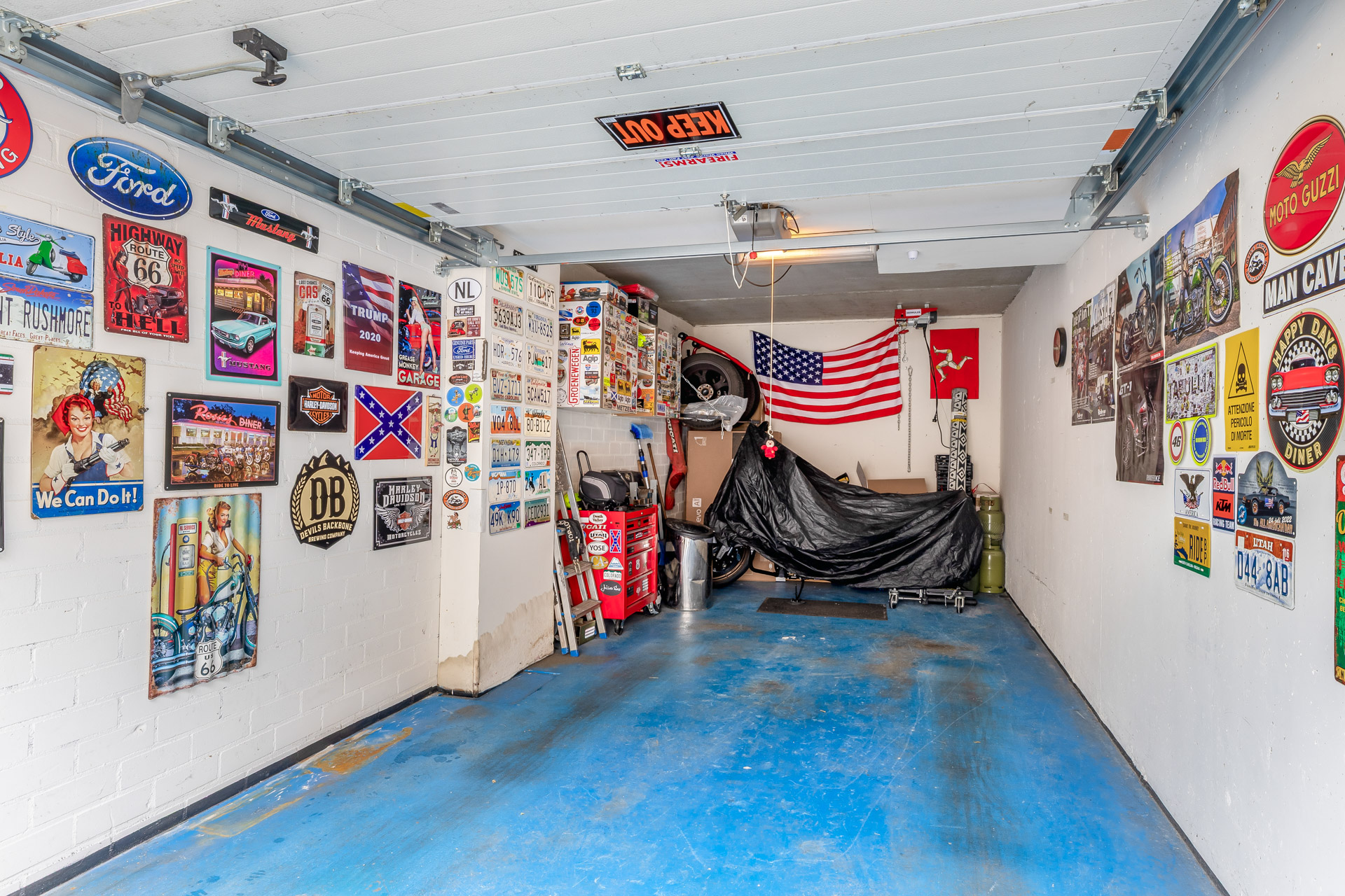 De eigen, grote garage is voorzien van een elektrische poort en elektra binnenin. Er is plek voor één auto.