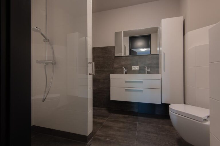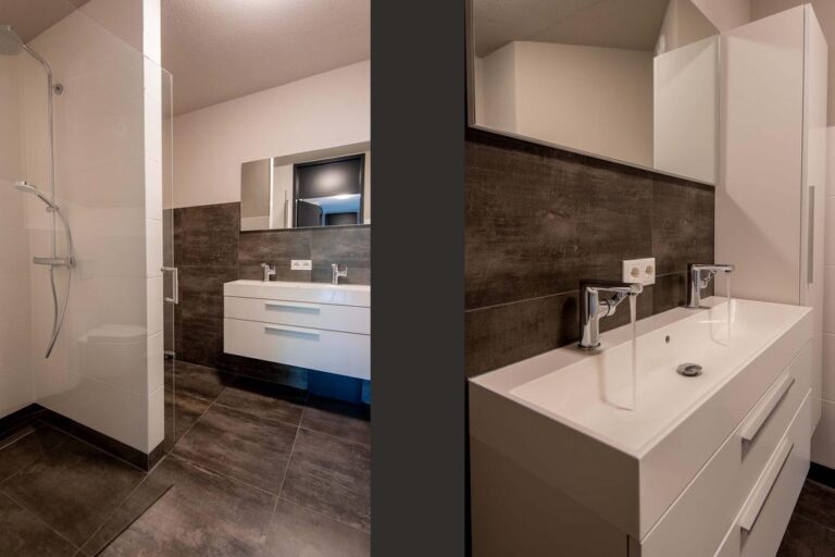 Overloop met toegang tot de 3 ruime slaapkamers (resp. ± 7 m², 13 m² en 15 m²). Luxe betegelde badkamer met inloopdouche met regen- en handdouche, dubbele wastafel met badkamermeubel en zwevend toilet. Hier bevindt zich tevens de witgoedaansluiting.
