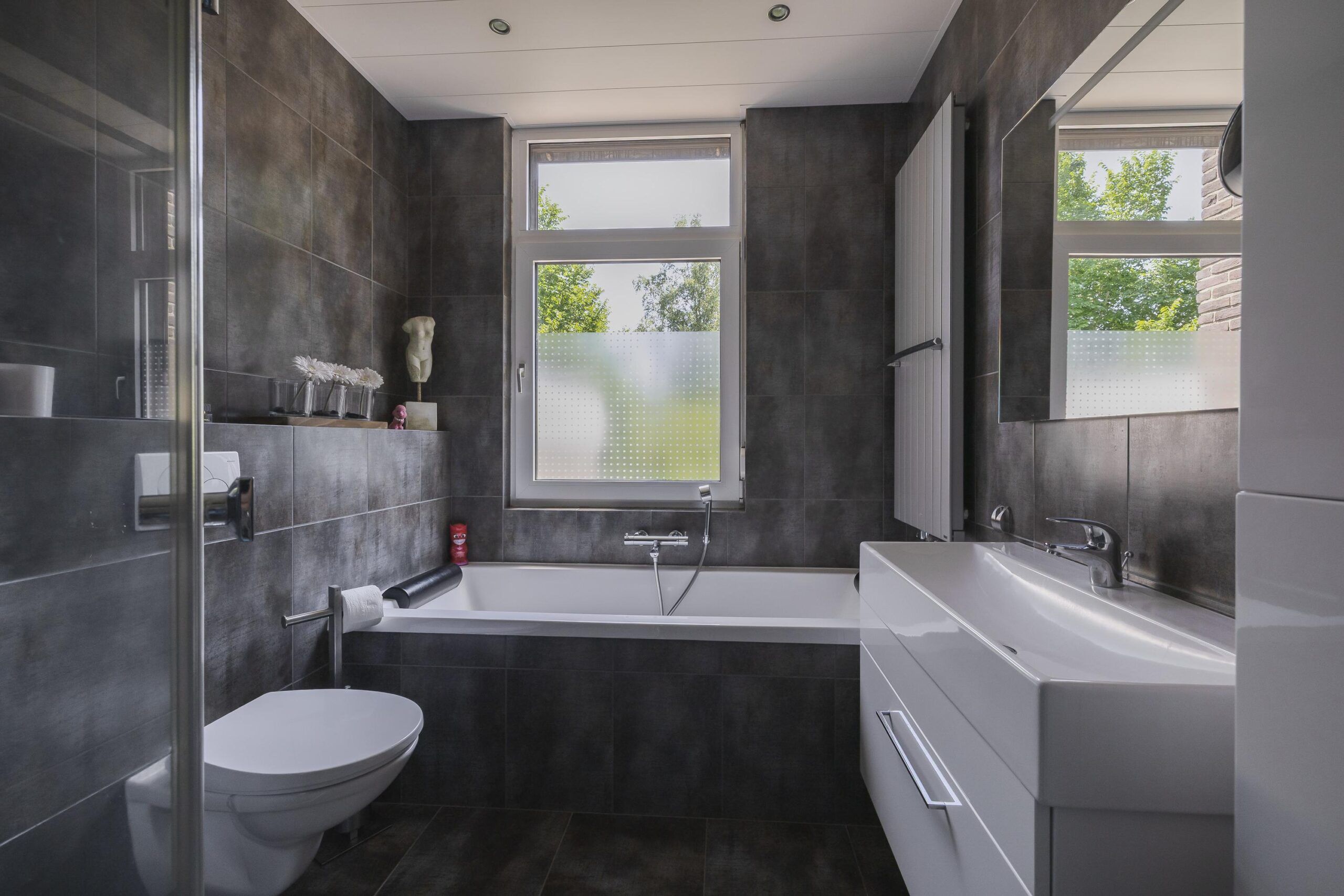 In de ruime, geheel betegelde badkamer (ca. 6m²) zijn een ligbad, douche met zitje, toilet, wastafelmeubel, designradiator en mechanische ventilatie aanwezig. Het raam met rolluik zorgt voor voldoende daglicht.