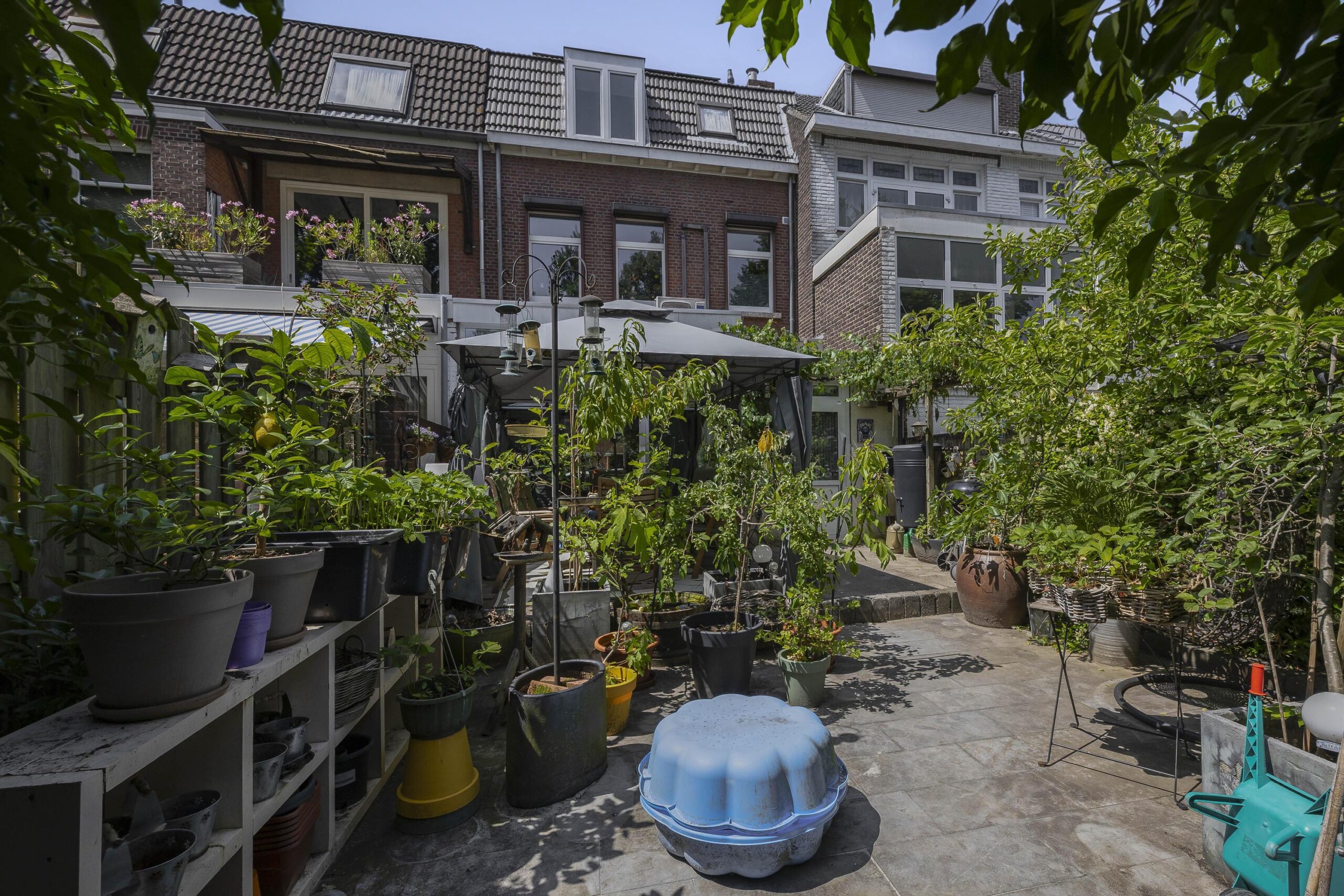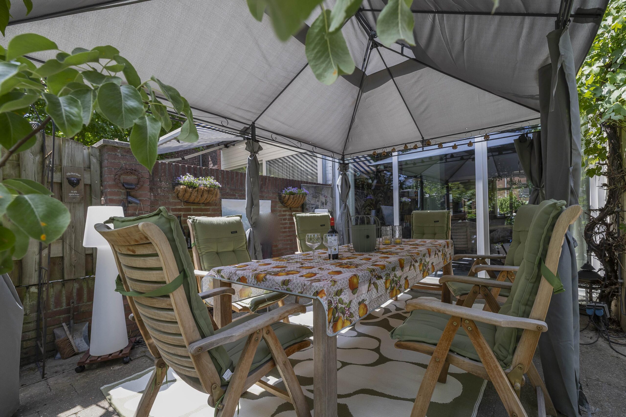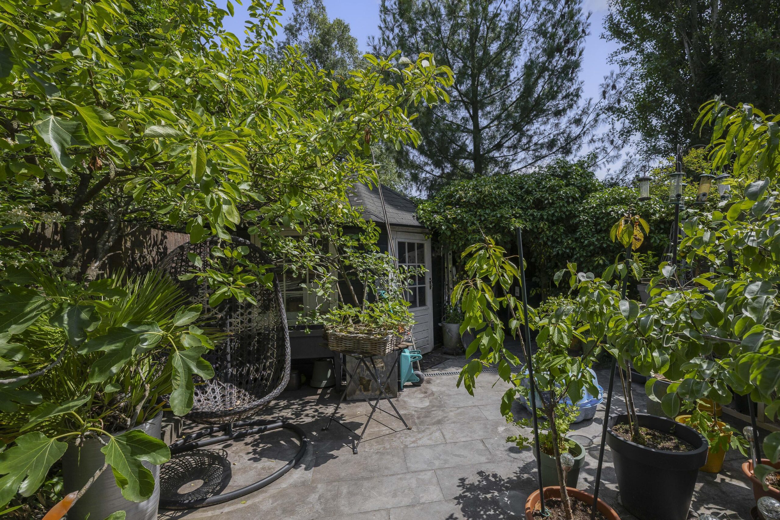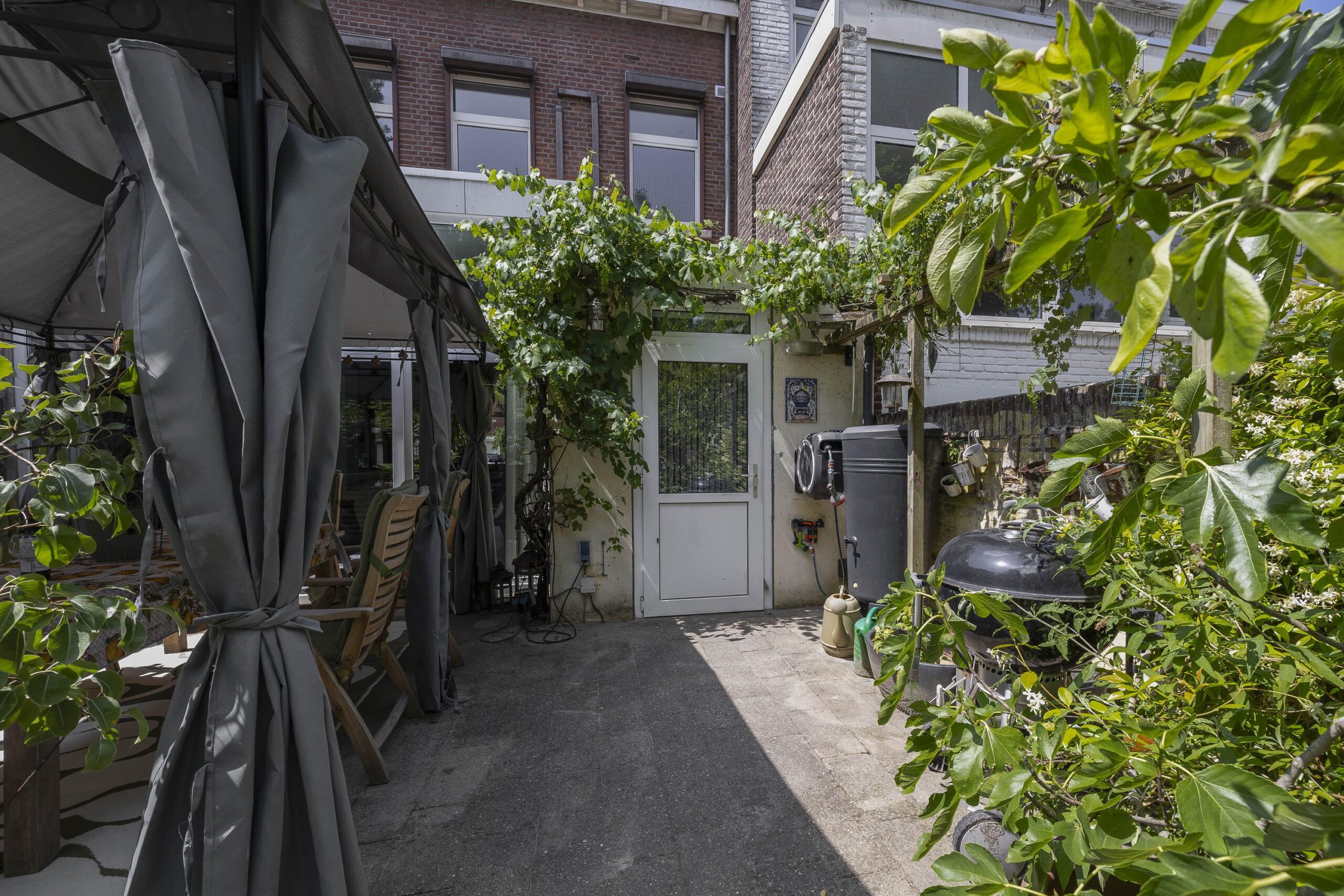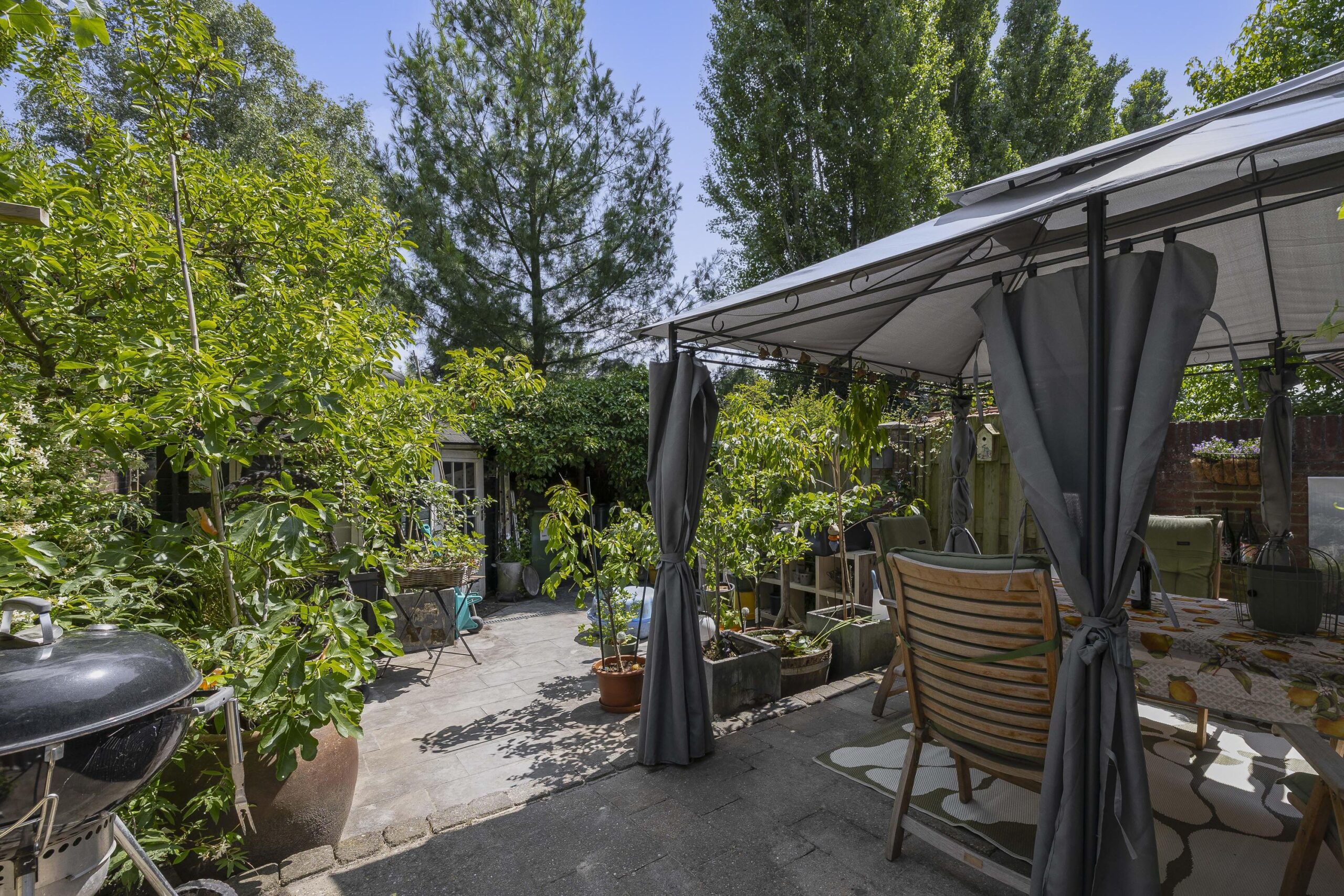 De gezellige stadstuin is groen aangelegd en geheel omheind. Er is geen inkijk waardoor je hier geniet van optimale privacy. Achterin bevindt zich het houten tuinhuisje (ca. 6,5m²) met elektra en een kleine overkapping.
