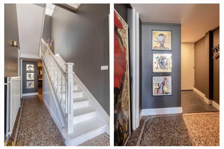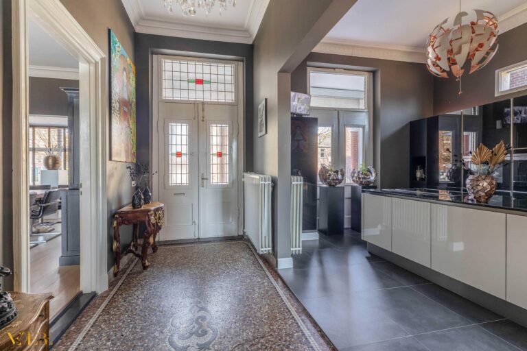 In de ruime en mooie entree ligt de originele terrazzo vloer en bevinden zich nog originele ornamenten. Tevens is het originele trappenhuis direct zichtbaar. Aan de linkerzijde bevinden zich de open keuken en de lounge/bar. Aan de rechterzijde bevindt zich de royale woonkamer met aangrenzend de tuinkamer. Aan het einde van de hal is er toegang tot het toilet en de kelder.