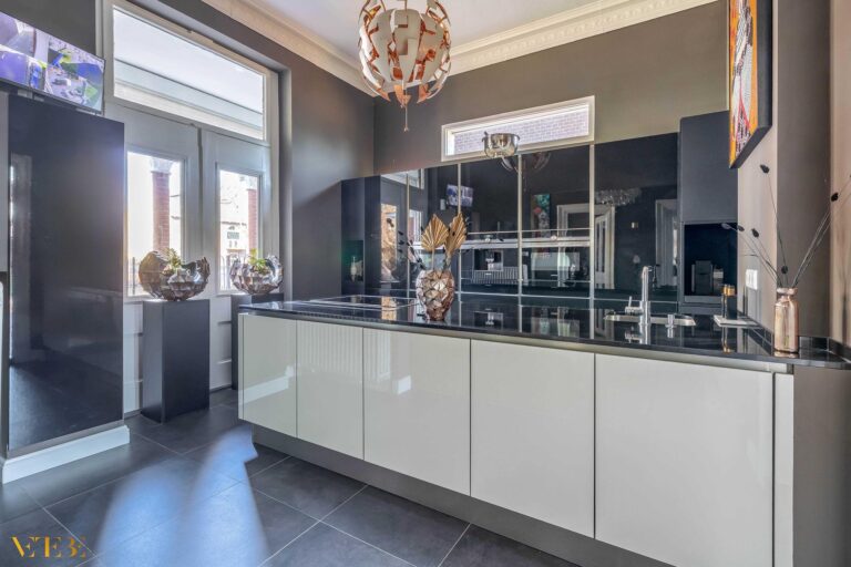De keuken (ca. 14m²) is meteen links van de entree gesitueerd. Er ligt een tegelvloer en de keukeninrichting is deels hoogglans zwart (kasten- en apparatenwand) en deels hoogglans wit (eiland). De kastenwand is voorzien van een ingebouwd koffiezetapparaat, 2 ovens, koelkast en vriezer. Het eiland is voorzien van een inductiekookplaat, afzuigkap, vaatwasser en granieten werkblad.
