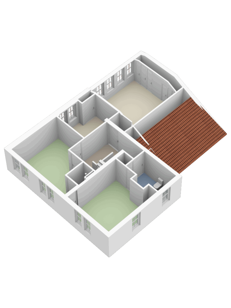 Vanuit de overloop zijn de twee slaapkamers met de twee badkamers en vervolgens het tussenportaal met aangrenzend de andere twee slaapkamers en het zoldertje bereikbaar.