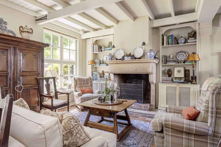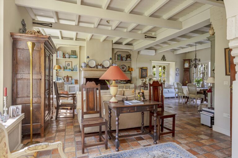 De woonkamer is zeer ruim (ca. 47m²) en voorzien van een haard, airco en 2x openslaande deuren naar de tuin. Het is er heerlijk licht door de vele ramen aan zowel de voor als achterzijde van de woning. Het toilet bevindt zich in een klein tussenhalletje.