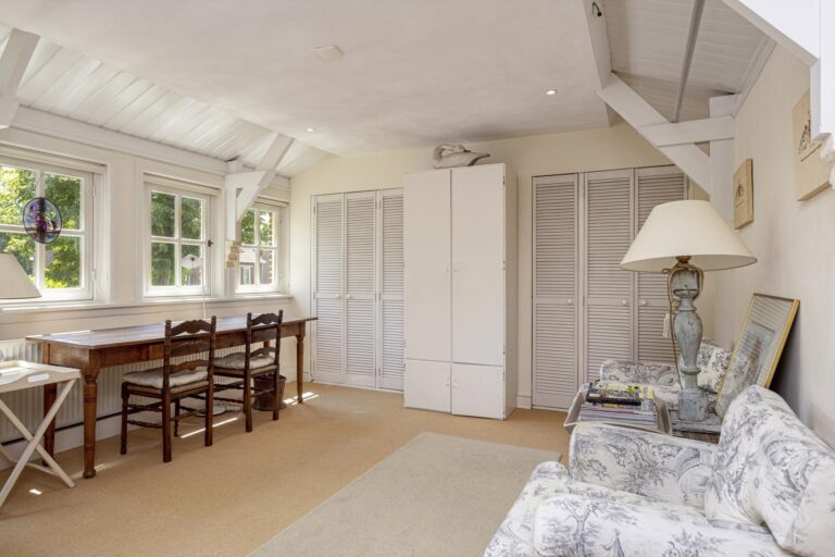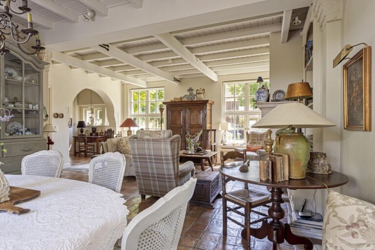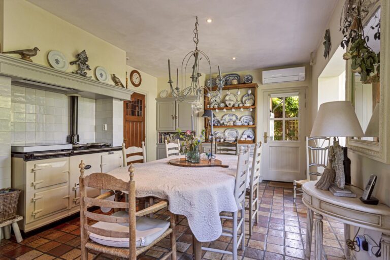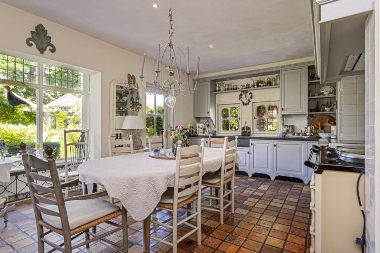 Een mooie, grote erker met direct tuinzicht kenmerkt de riante leefkeuken (ca. 22m²). Er zijn een AGA fornuis (ter overname), vaatwasser, koelkast en boiler aanwezig. Een airco zorgt voor een altijd aangename temperatuur. Vanuit de keuken zijn er twee loopdeuren richting de tuin.