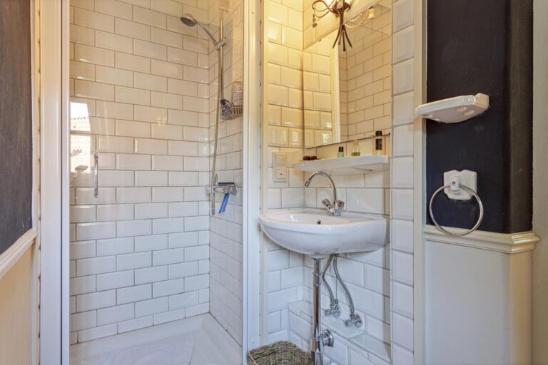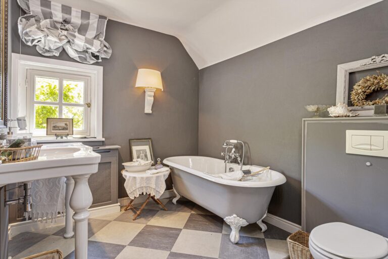 In de badkamer (ca. 6,5m²) zijn een vrijstaand ligbad, wastafel, toilet (sanibroyeur) en spotjes aanwezig. Alles is handgemaakt. Het raam zorgt voor daglicht en natuurlijke ventilatie.