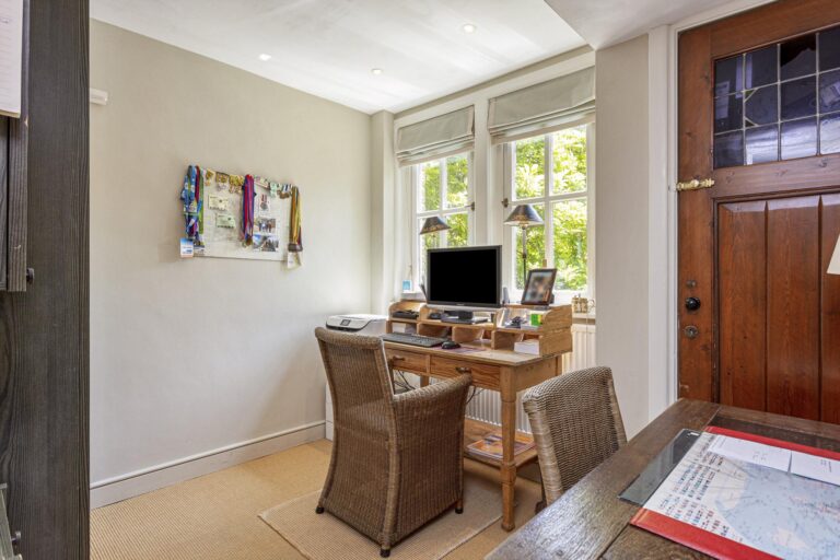 Het tussenportaal biedt toegang tot de andere twee slaapkamers. Een daarvan is momenteel ingericht als kantoor/hobbykamer (ca. 16,5m²) en heeft een muurkast. De andere slaapkamer (ca. 7,5m²) is voorzien van 2 grote wandkasten.