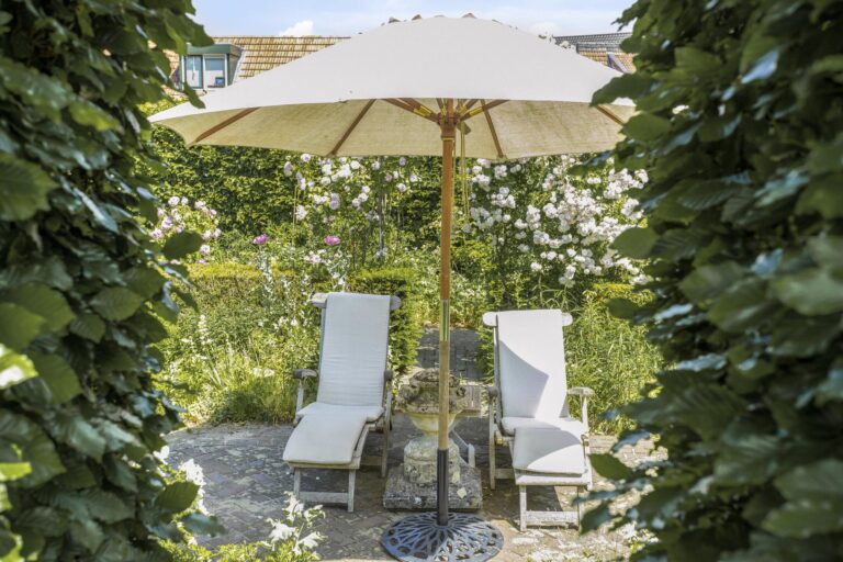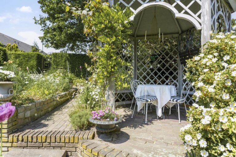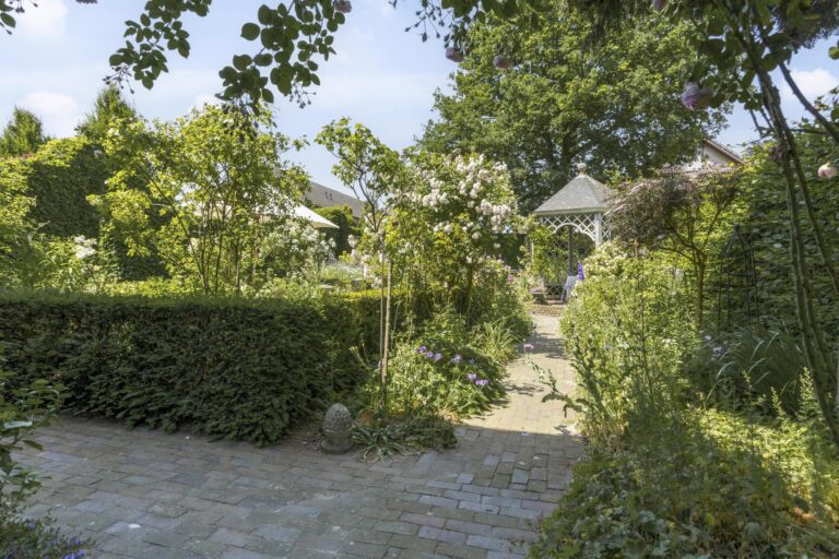 De achtertuin is prachtig groen aangelegd en volledig omheind. Vanuit zowel de linker- als rechterkant van de woning is er toegang tot de achtertuin. Het eigen ontworpen en gebouwde prieeltje maakt dat je hier heerlijk kunt vertoeven. Er is een sproei installatie aanwezig.