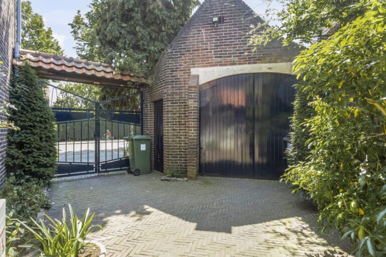 Aan de linkerzijde biedt de eigen oprit toegang tot de grote garage (ca. 34m²). Daarnaast zit een grote openslaande tuinpoort voor vrije toegang. De garage biedt plek voor 1 auto en is voorzien van een elektrische poort, elektra, vliering en kleine berging.