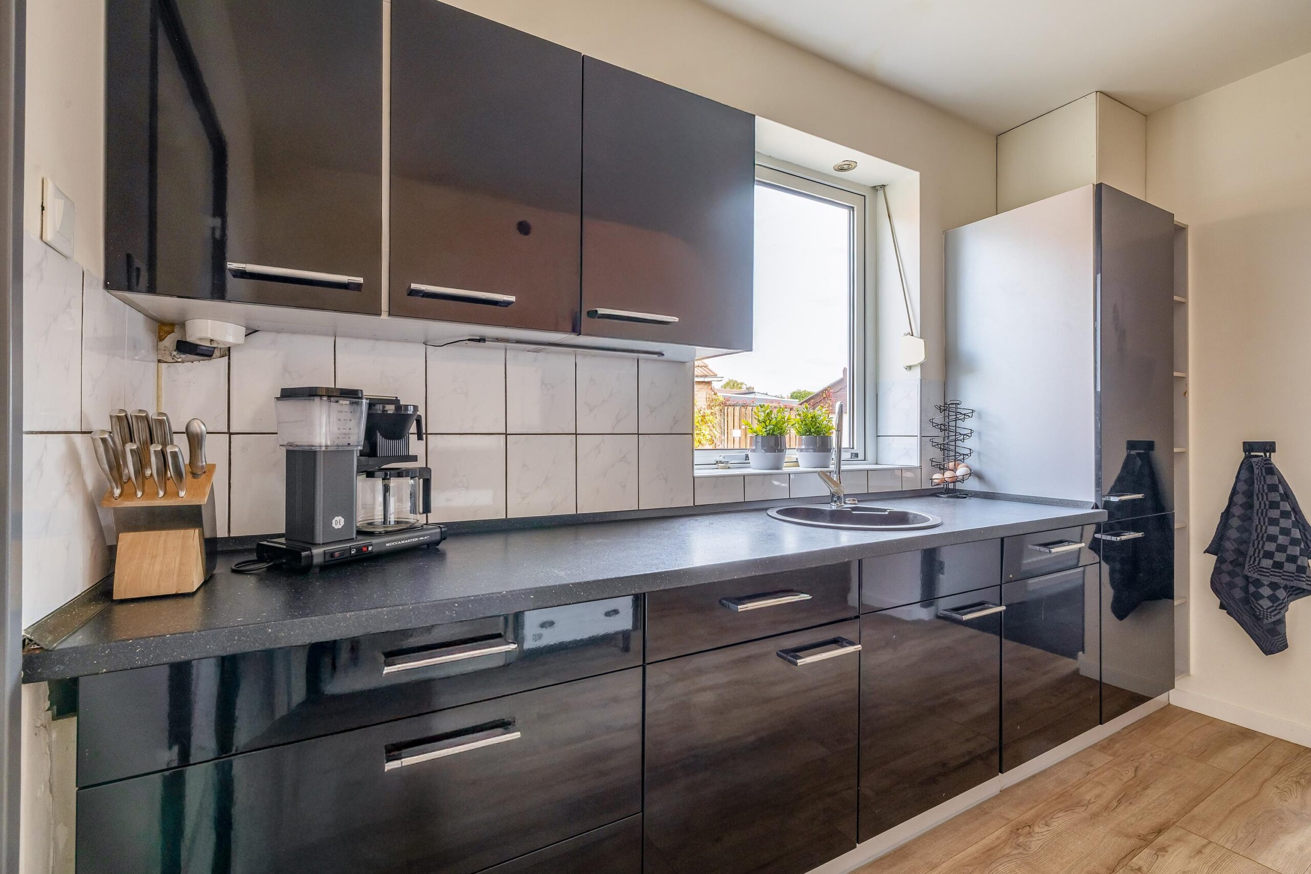 De keuken staat in open verbinding met de uitgebouwde woonkamer. Hier ligt een laminaatvloer. Dankzij de grote schuifpui (met hor) aan de achterzijde geniet je hier van veel lichtinval en directe toegang tot de tuin. De aanbouw is voorzien van vloerverwarming.