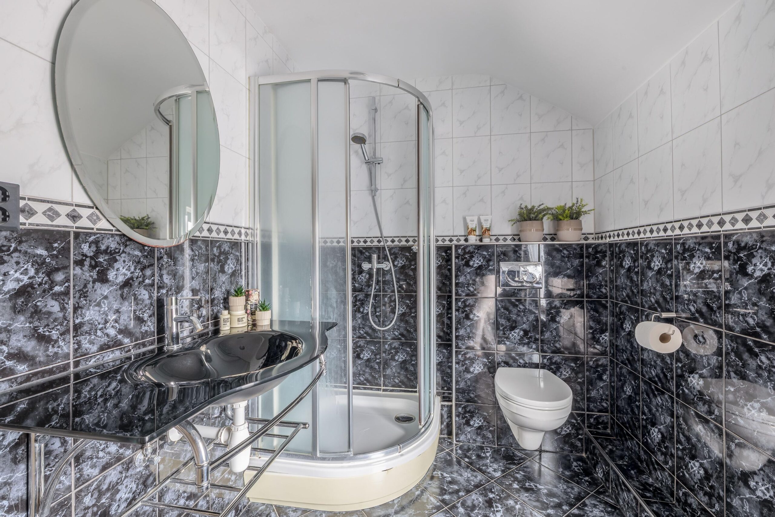 De volledig betegelde badkamer beschikt over een vaste wastafel, douchecabine, toilet en een designradiator. Het raam zorgt voor voldoende daglicht.