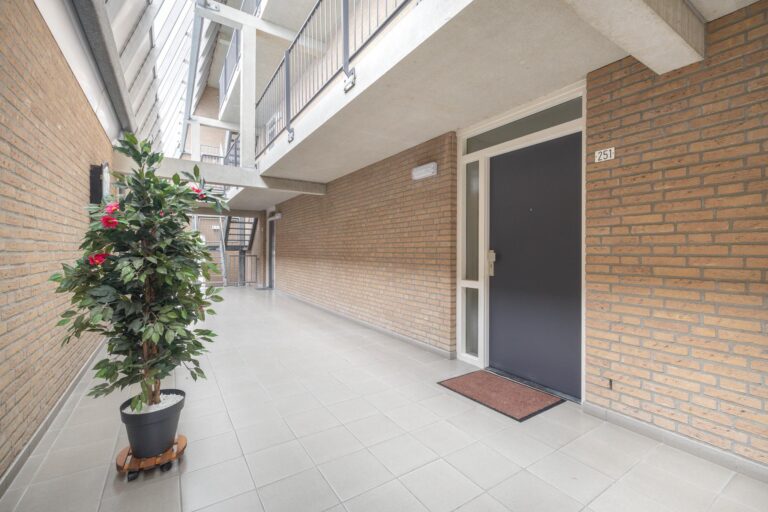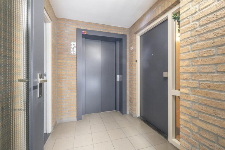 Bij binnenkomst vind je een overdekte entree met een luifel, intercom, brievenbussen en bellentableau. Via de nette hal met trappenhuis en lift bereik je de gang naar het appartement.