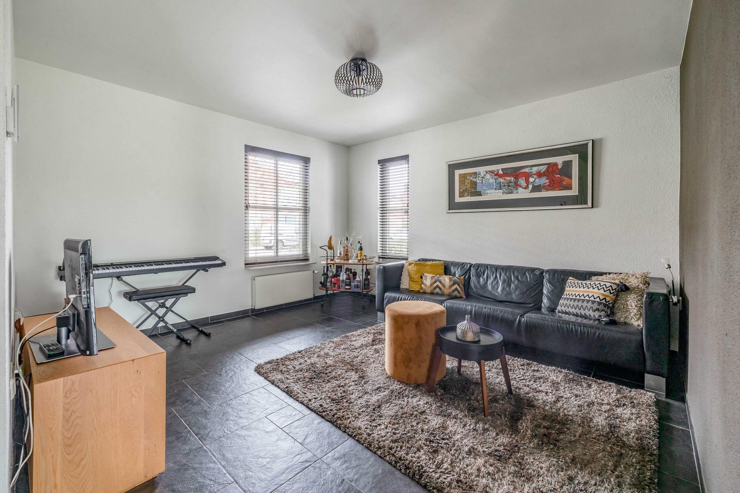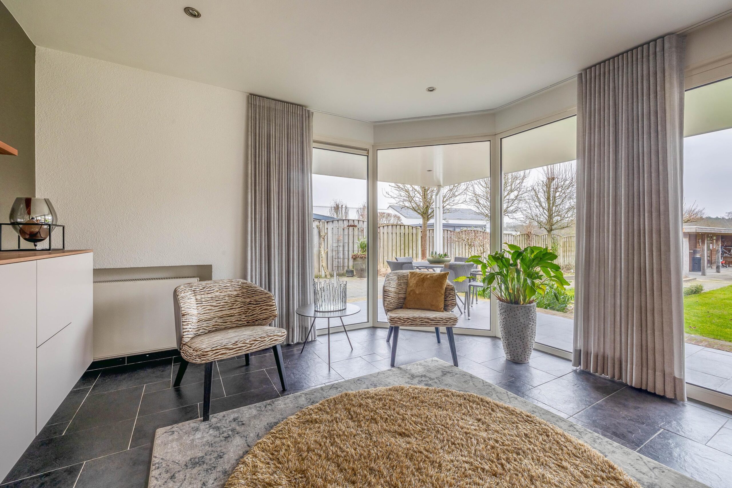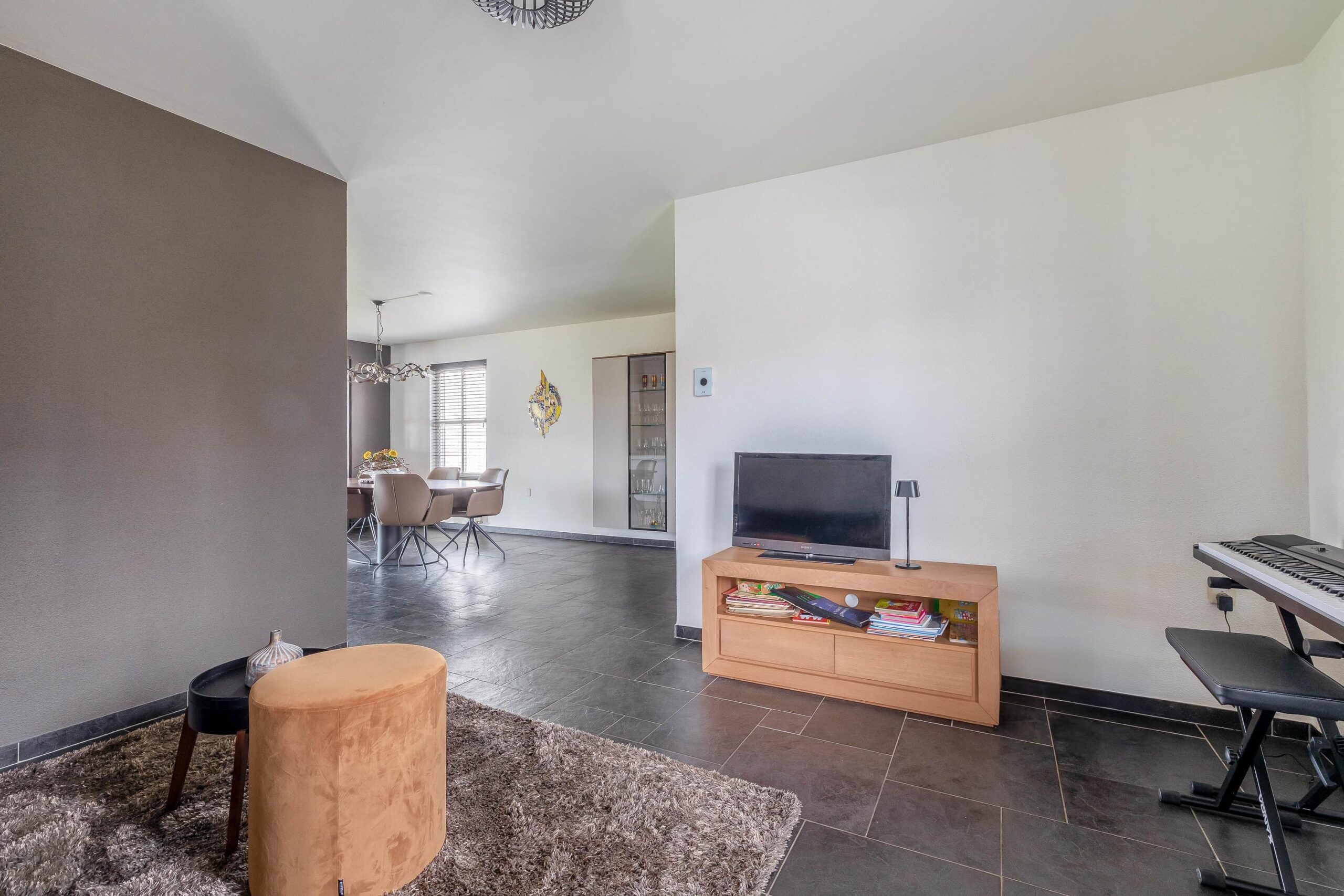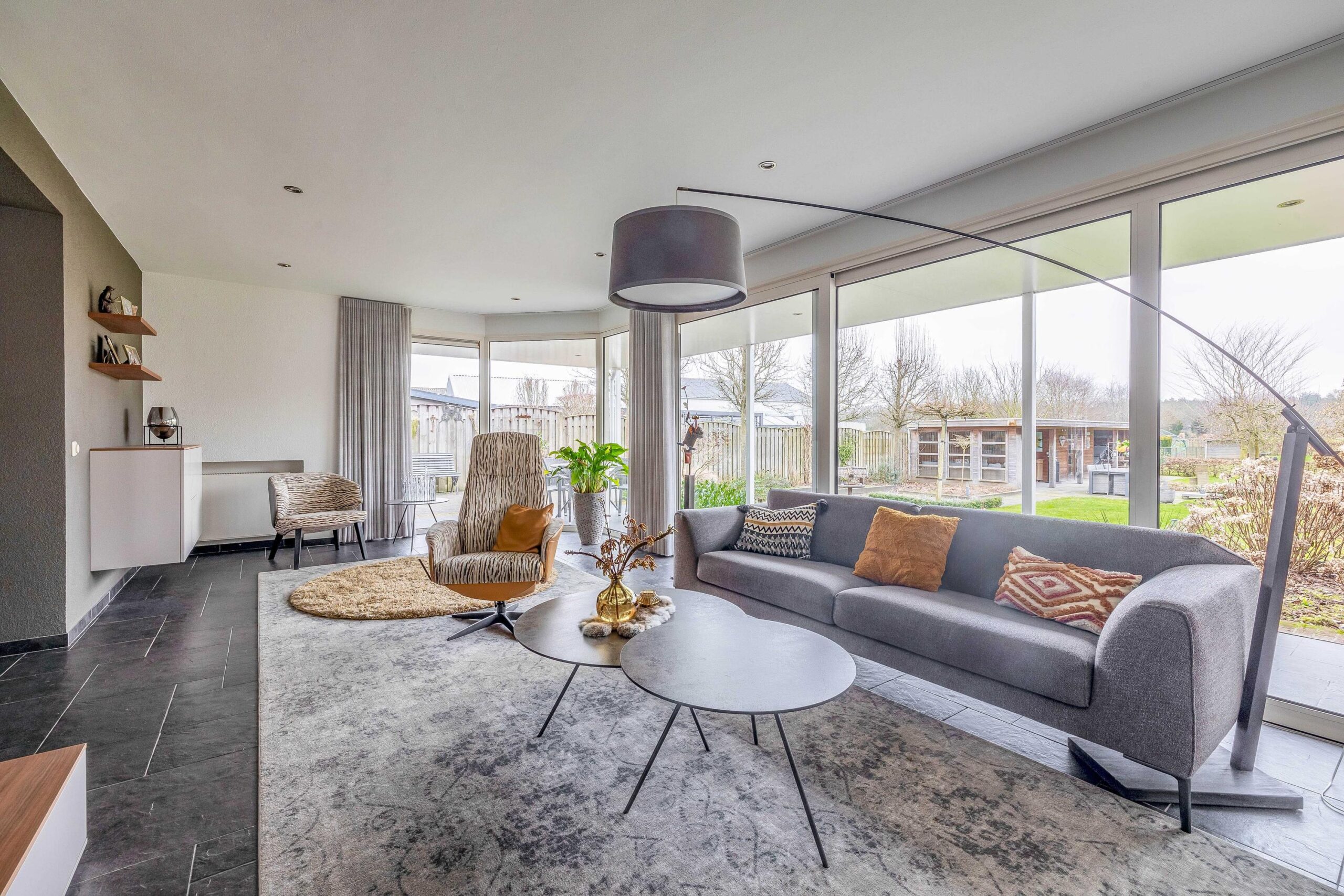 De riante woonkamer (ca. 78m² in totaal) is verdeeld in meerdere gedeeltes. Het hoogtepunt is de tuinkamer (ca. 30m³) aan de achterzijde. Hier biedt de glazen schuifpui zicht op de eigen achtertuin. Het is een heerlijke ruimte waar je geniet van het aanwezige groen. De gashaard zorgt hier voor extra sfeer.
