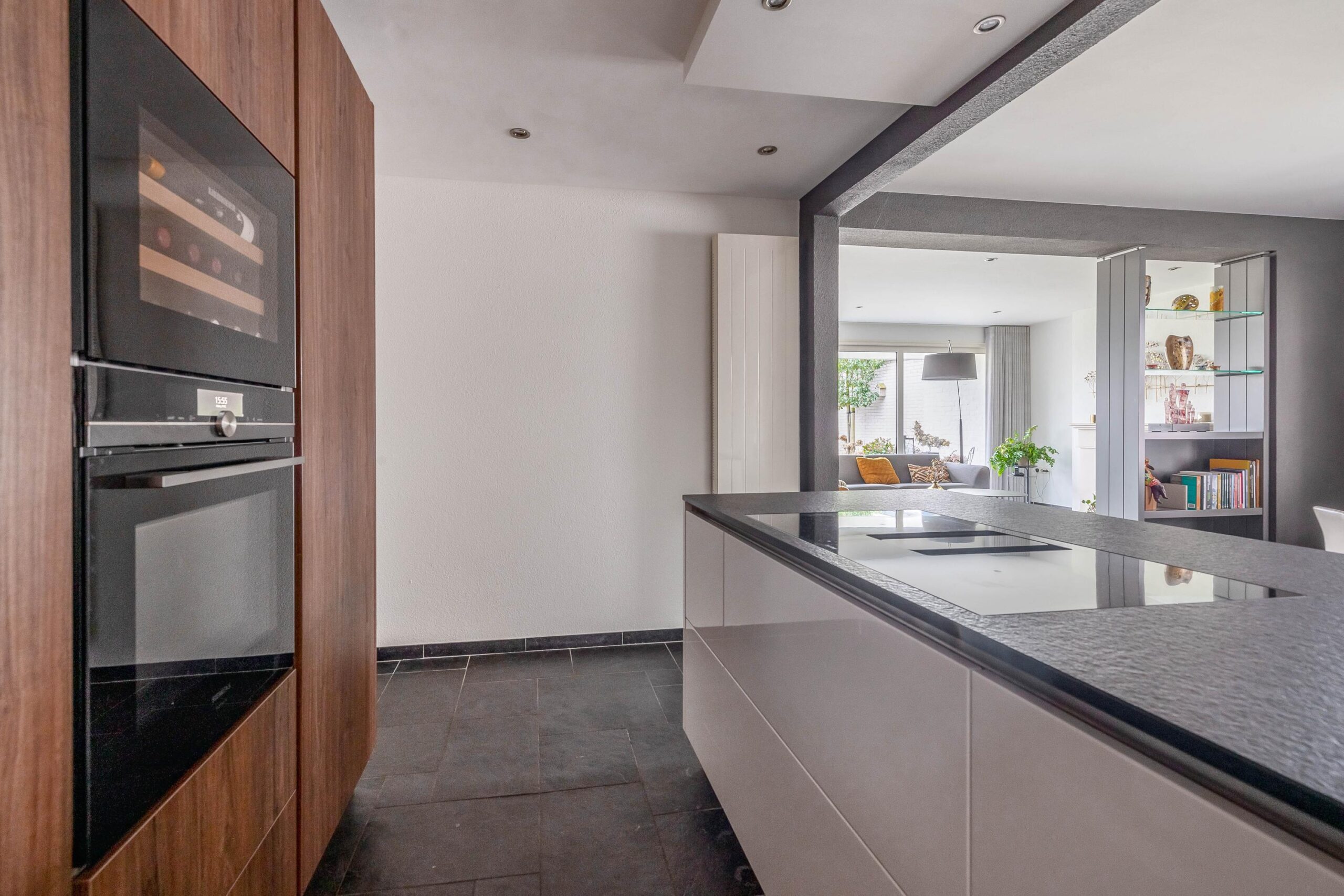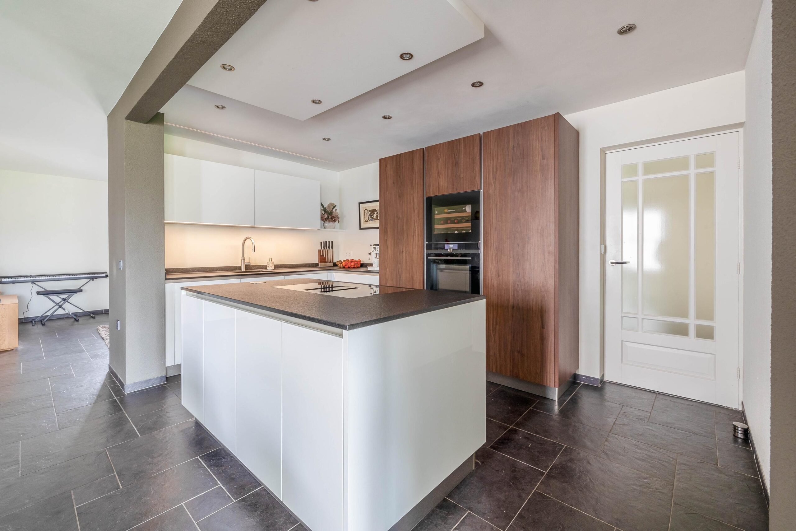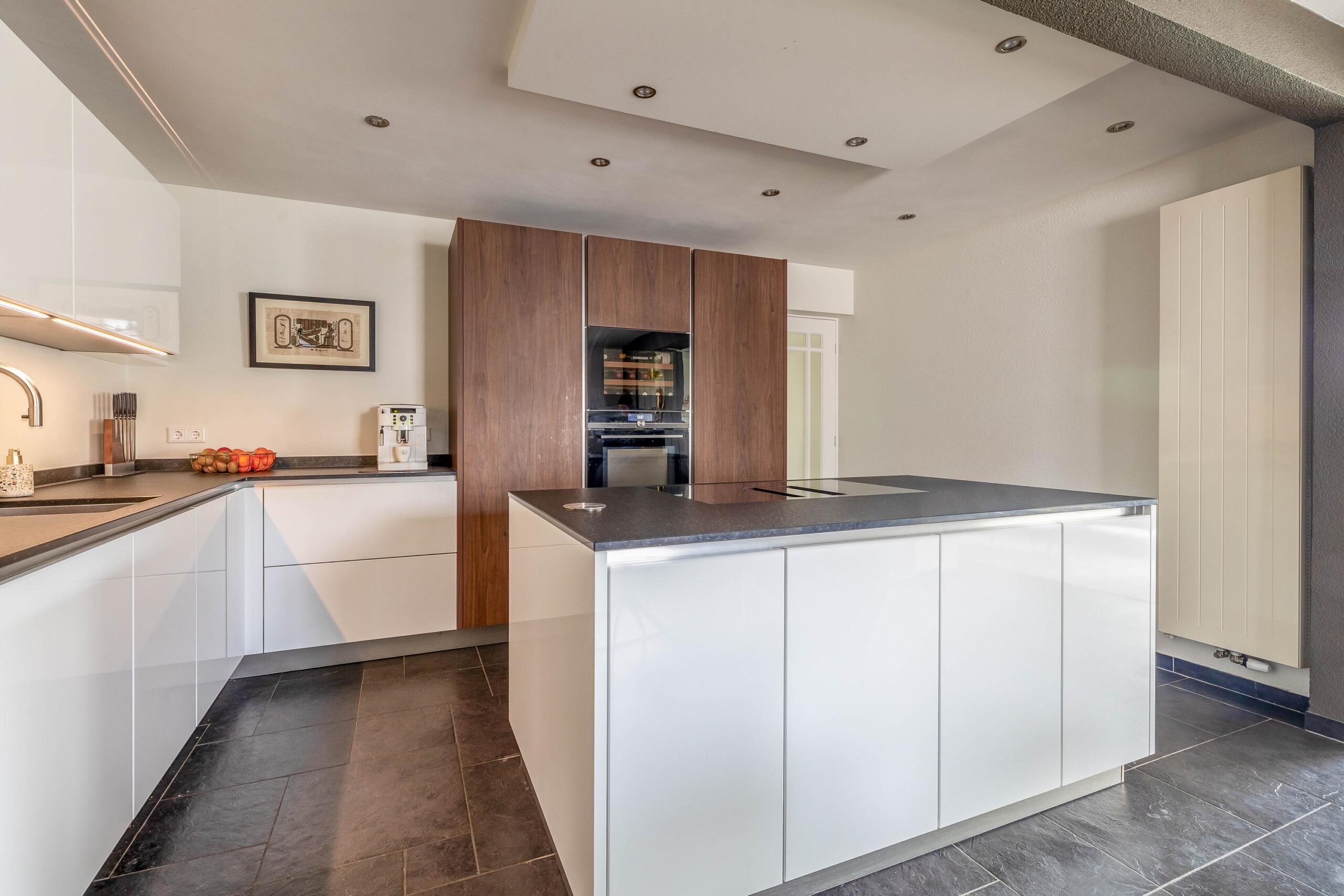 De open keuken is volledig uitgerust met een inductiekookplaat met geïntegreerde afzuiging, een vaatwasser, grote koelkast, wijnkoeler/klimaatkast, oven, stoomoven en Quooker. Een loopdeur biedt toegang tot de bijkeuken.