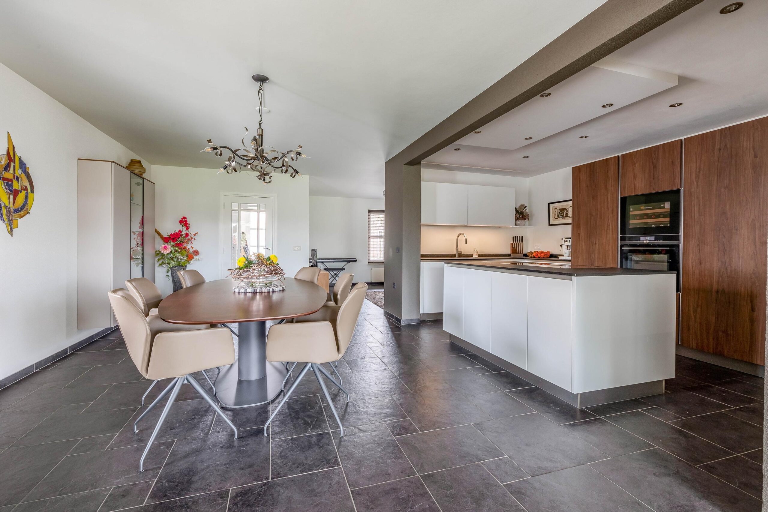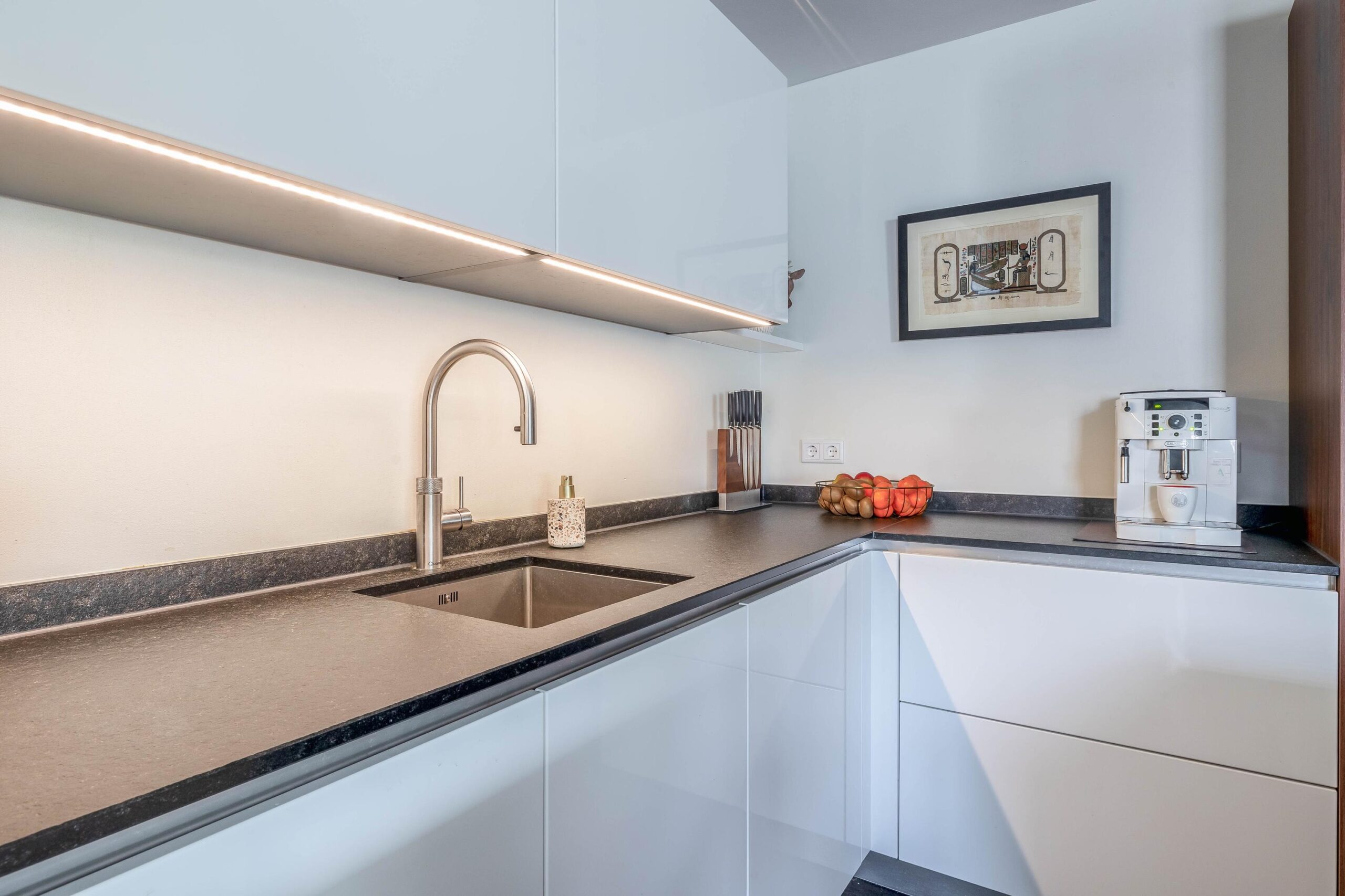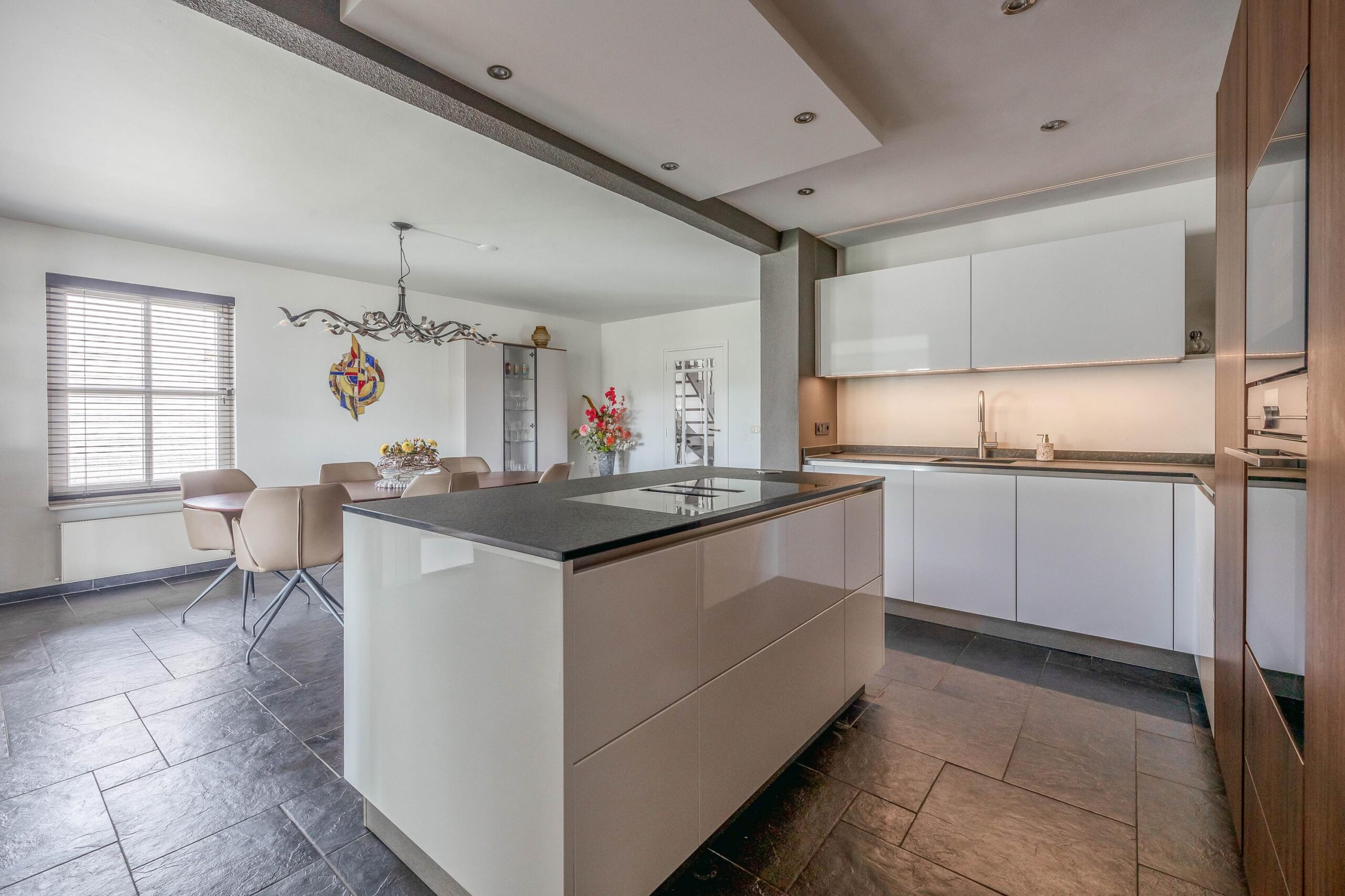 De open keuken is volledig uitgerust met een inductiekookplaat met geïntegreerde afzuiging, een vaatwasser, grote koelkast, wijnkoeler/klimaatkast, oven, stoomoven en Quooker. Een loopdeur biedt toegang tot de bijkeuken.