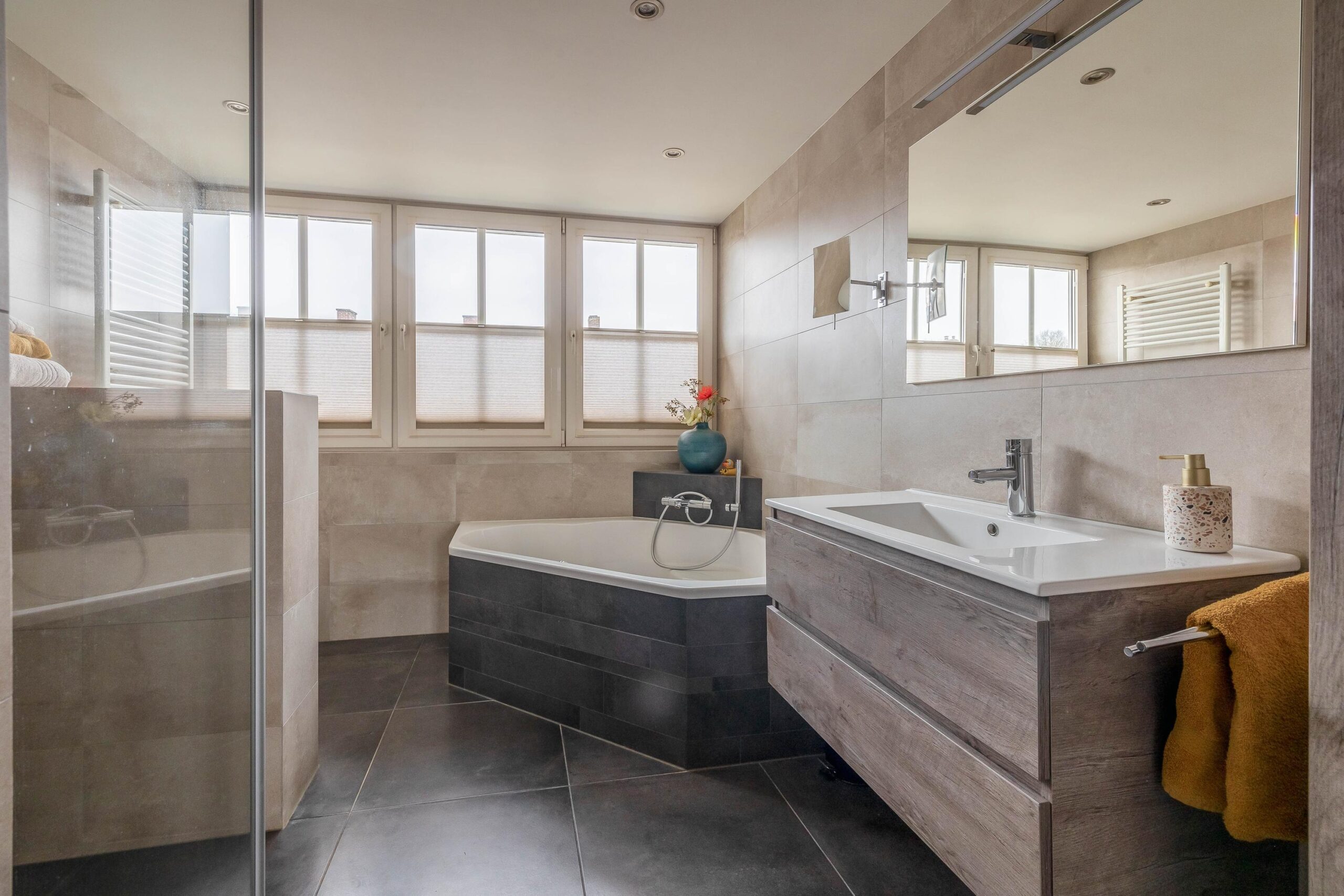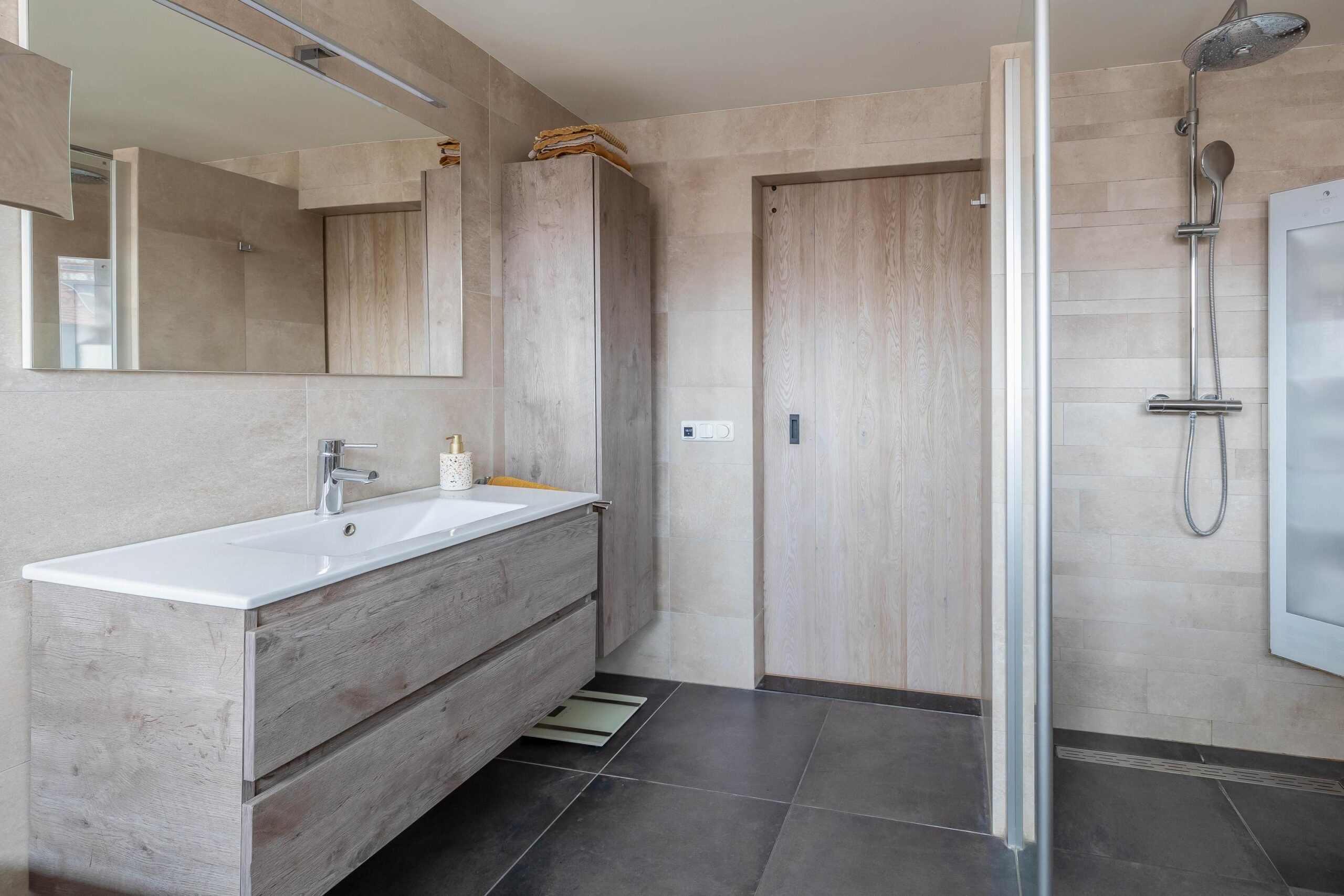 In de badkamer (ca. 8,5m²) ligt elektrische vloerverwarming. Er zijn ligbad, inloopdouche, wastafelmeubel en toilet aanwezig. Het raam zorgt voor daglicht.