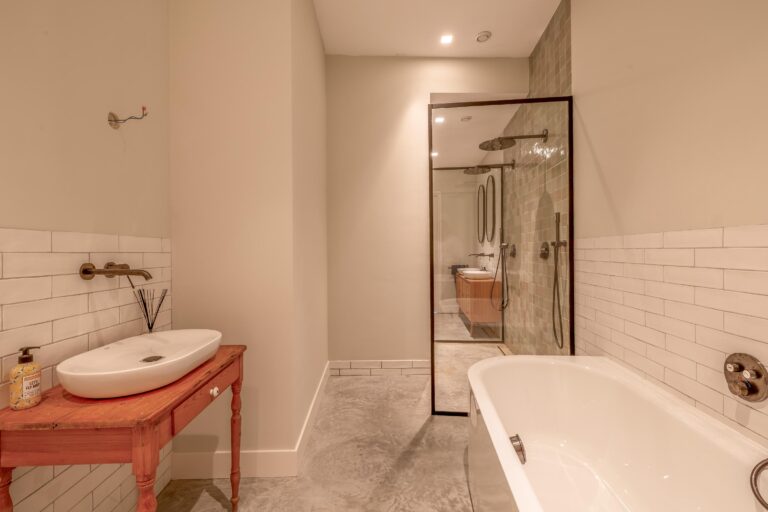 Het toilet is voorzien van een fonteintje. De grote en langwerpige badkamer is bereikbaar vanuit beide hallen. De badkamer is uitgerust met een ligbad, een grote, dubbele inloopdouche, een dubbel wastafelmeubel en nog een losse wastafel.