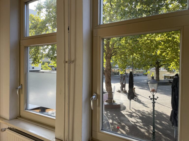 Hal met toegang tot het aparte toilet, de wasruimte (ca. 7,9 m²) en een buitenruimte (ca. 6 m²). Middels een dubbele klapdeur is de woonkamer (ca. 37,5 m²) met open keuken (ca. 7,2 m²) bereikbaar. De verhoging in de woonkamer zorgt voor een speels effect. De keuken is recent vernieuwd en ingericht met een vaatwasser, inductiekookplaat, afzuigkap, koelkast en een combi oven/magnetron. De vele ramen bieden een heerlijk uitzicht over het plein.