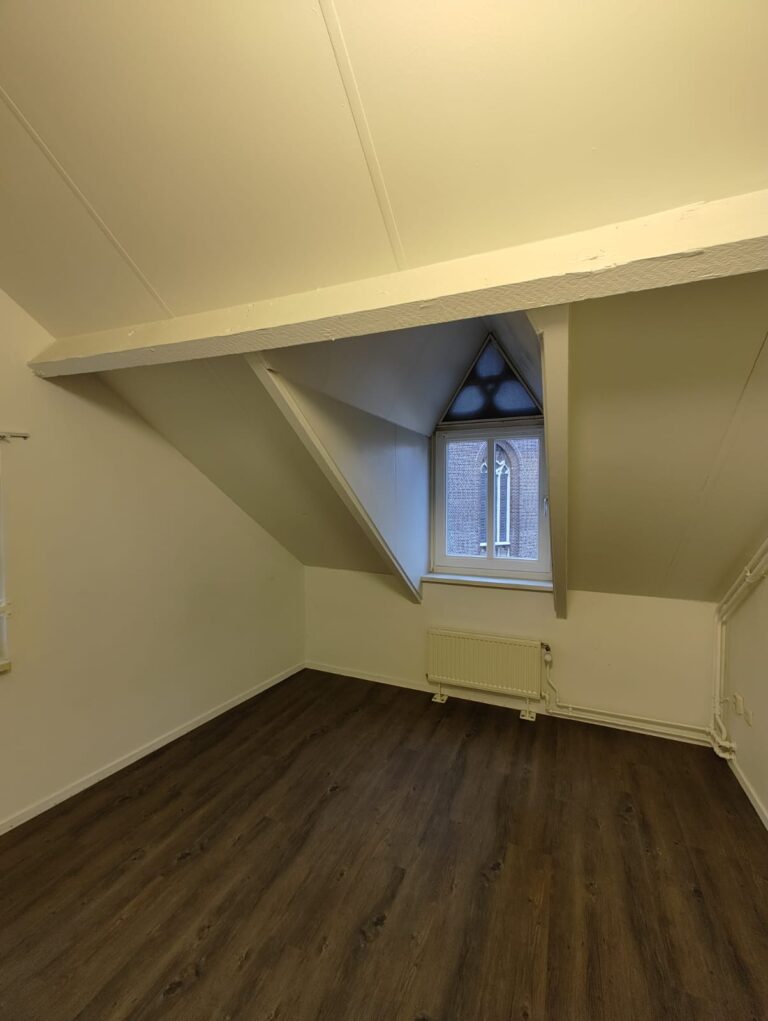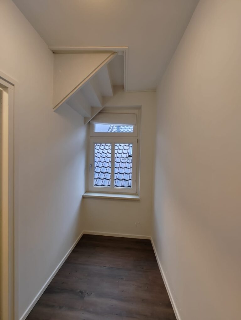 Entree/gang met toegang tot de half betegelde toilet met fonteintje, bijkeuken en geheel betegelde badkamer met douche en wastafel. Toegang tot de ruime en sfeervolle woonkamer van ca. 26 m². De woonkamer biedt een leuk uitzicht richting de kerk. Achterliggende ruimte welke kan dienen als bijvoorbeeld kantoorruimte/werkkamer of extra slaapkamer (ca. 11 m²). Open leefkeuken (ca. 16 m²) met afzuigkap, elektrische kookplaat, oven en koelkast.