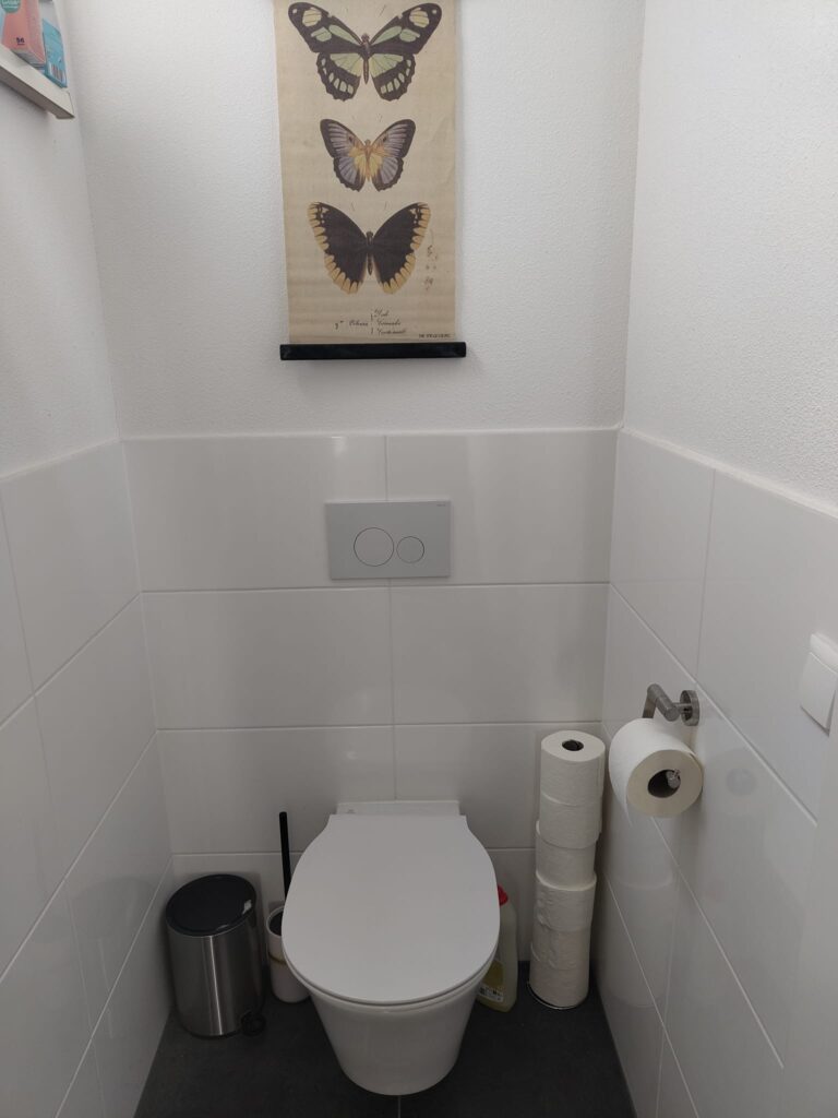 Entree/hal met geheel betegeld toilet met fontein en toegang tot alle vertrekken.