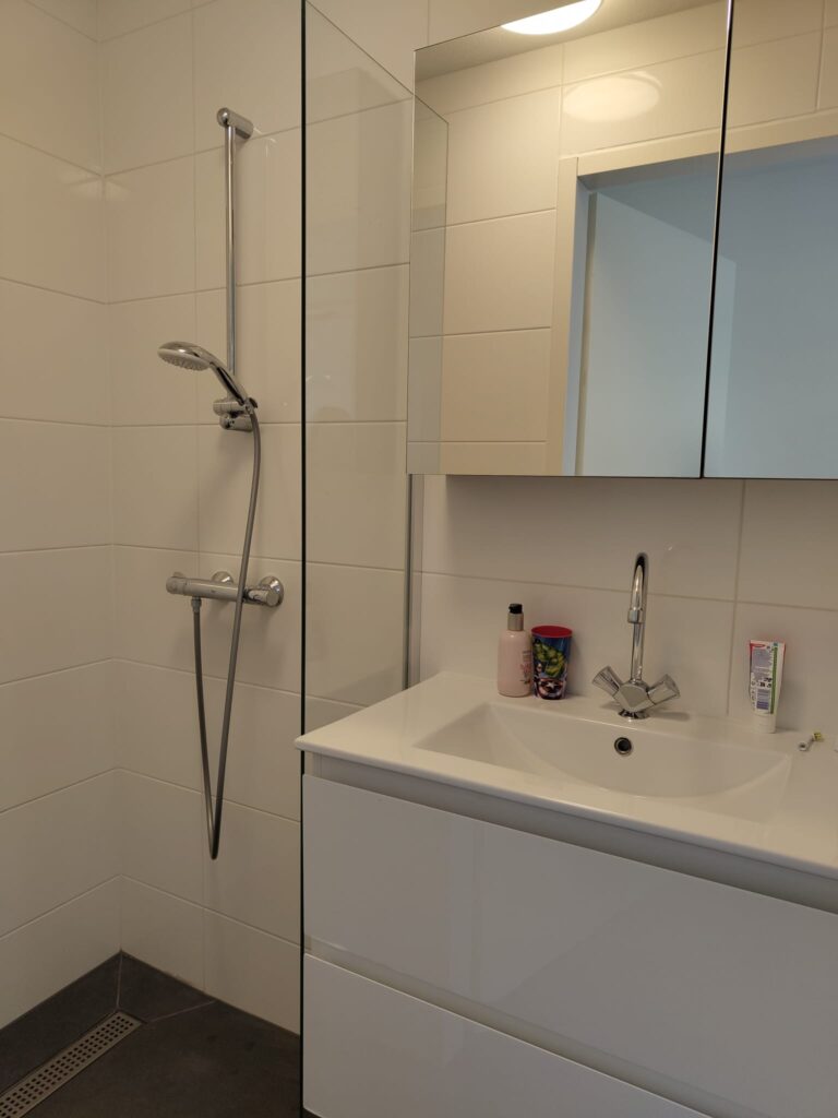 2 slaapkamers (ca. resp. 6 en 12 m²). Geheel betegelde badkamer voorzien van inloopdouche en wastafel met meubel.