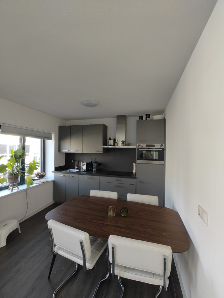 Sfeervolle ruime woonkamer (ca. 34 m²) met open keuken welke is voorzien van alle apparatuur zoals onder andere een afzuigkap, elektrische kookplaat, vaatwasser, koelkast en combi oven. Bijkeuken met witgoedaansluiting. Vanuit de gang is het ruime dakterras van ca. 23 m² bereikbaar waar het heerlijk vertoeven is.