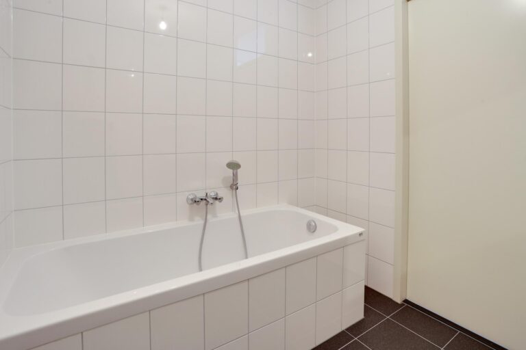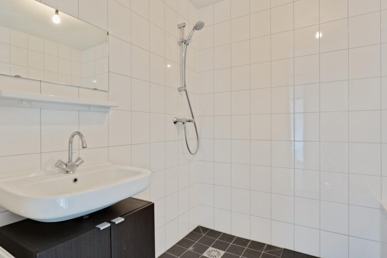 De geheel vernieuwde badkamer (ca. 5m²) is voorzien van een inloopdouche, ligbad en een vaste wastafel.