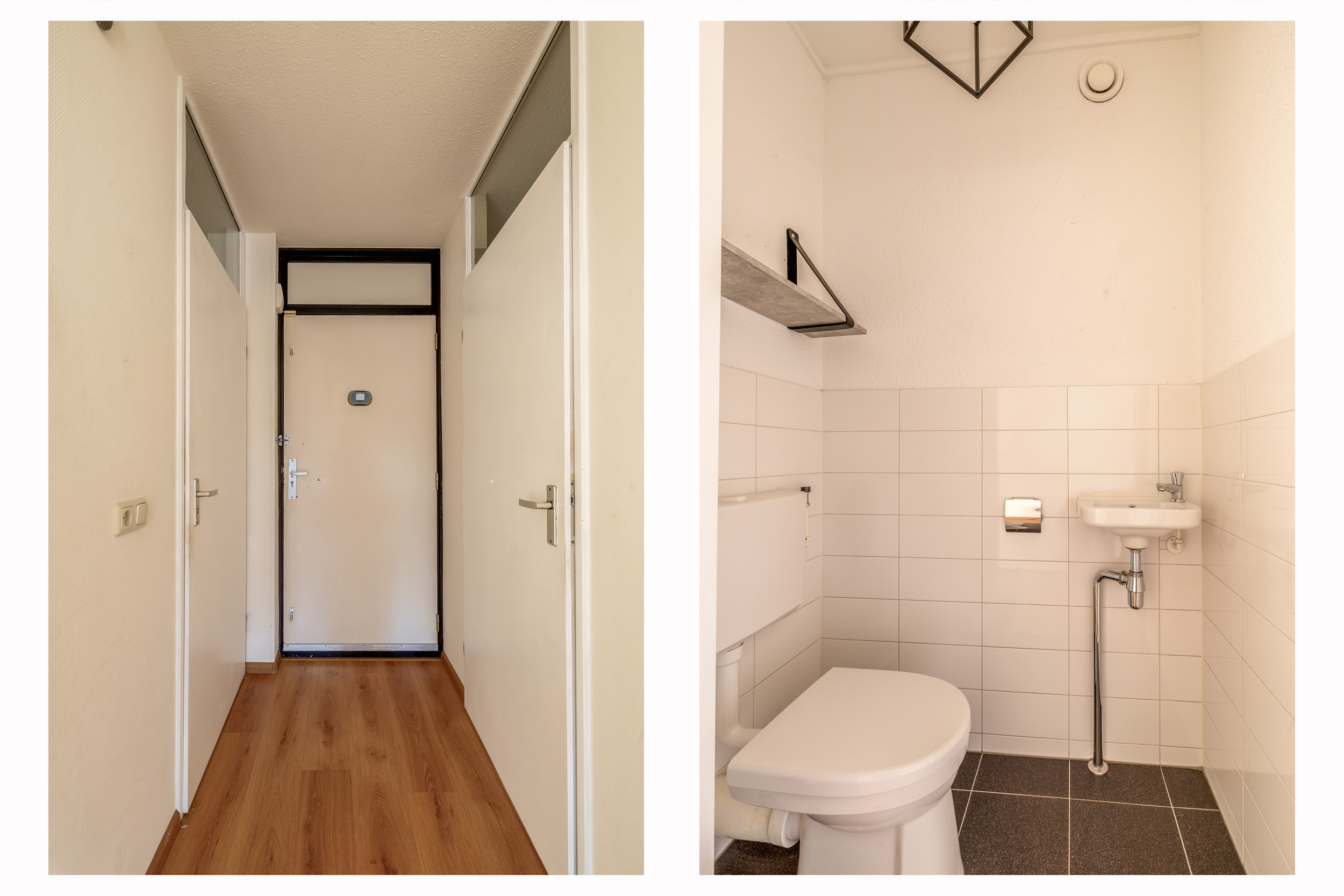 De ruime hal geeft toegang tot alle ruimtes. Het toilet is voorzien van een fonteintje en de volledig betegelde badkamer heeft een wastafel, ligbad en inloopdouche. De praktische berging (ca. 2,5m²) met witgoedaansluiting biedt extra gemak.