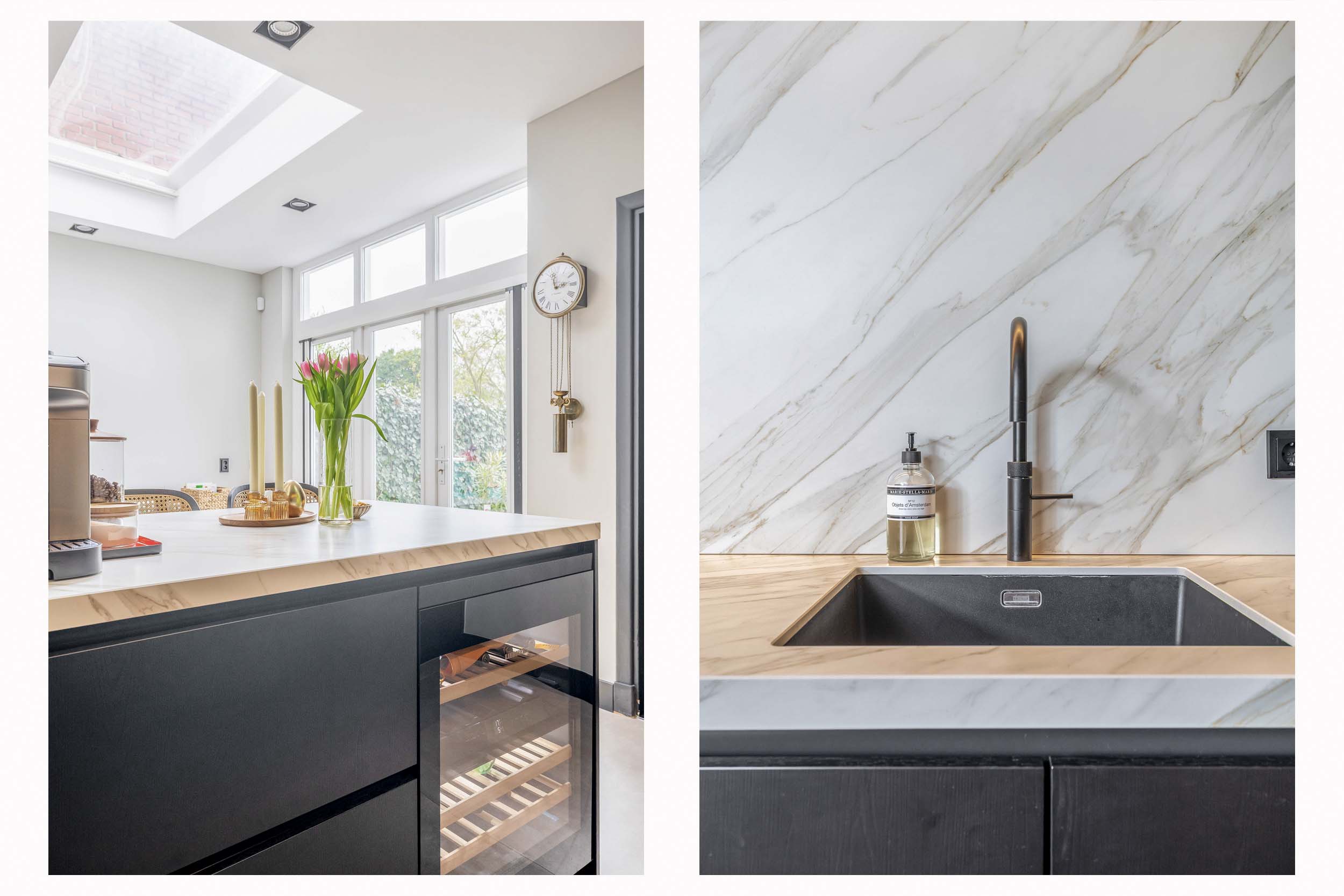 De ruime woonkamer heeft een mooie, natuurlijke lichtinval. Het grote dakraam met elektrisch plisségordijn draagt hieraan bij. Aan de achterzijde biedt de loopdeur directe toegang tot de tuin. Tevens bevindt zich achterin de mooie open keuken met Dekton-aanrechtblad. Je geniet hier onder andere van een Quooker met kokend én bruisend water, een wijnkoelkast, een inductiekookplaat met geïntegreerde afzuiging, een grote koelkast en een oven.