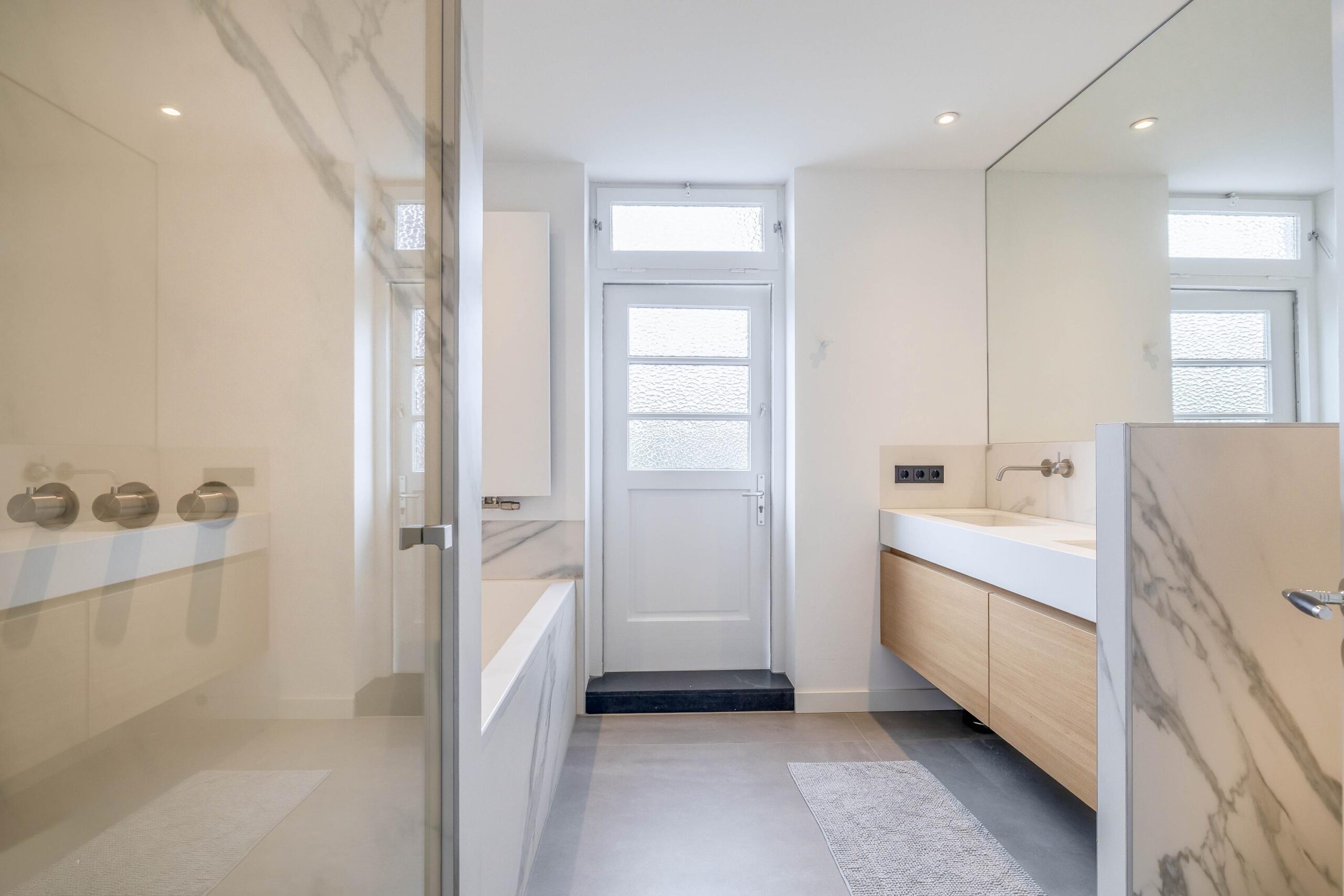 De ruime badkamer heeft elektrische vloerverwarming. Er zijn een ligbad, inloopdouche, dubbel wastafelmeubel, toilet, designradiator en mechanische ventilatie aanwezig. De loopdeur biedt toegang tot het dakterras (voorzien van zonnepanelen).