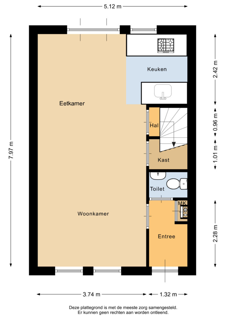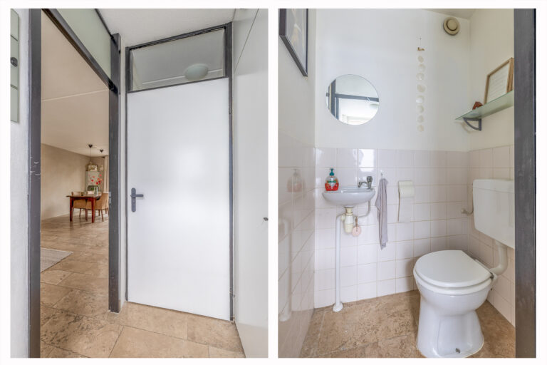 Bij binnenkomst tref je de hal met toilet, meterkast en toegang tot de woonkamer. De natuurstenen vloer met vloerverwarming zorgt voor comfort en een luxe uitstraling. De woonkamer is heerlijk licht dankzij de ramen aan beide zijden en beschikt over een praktische trapkast.