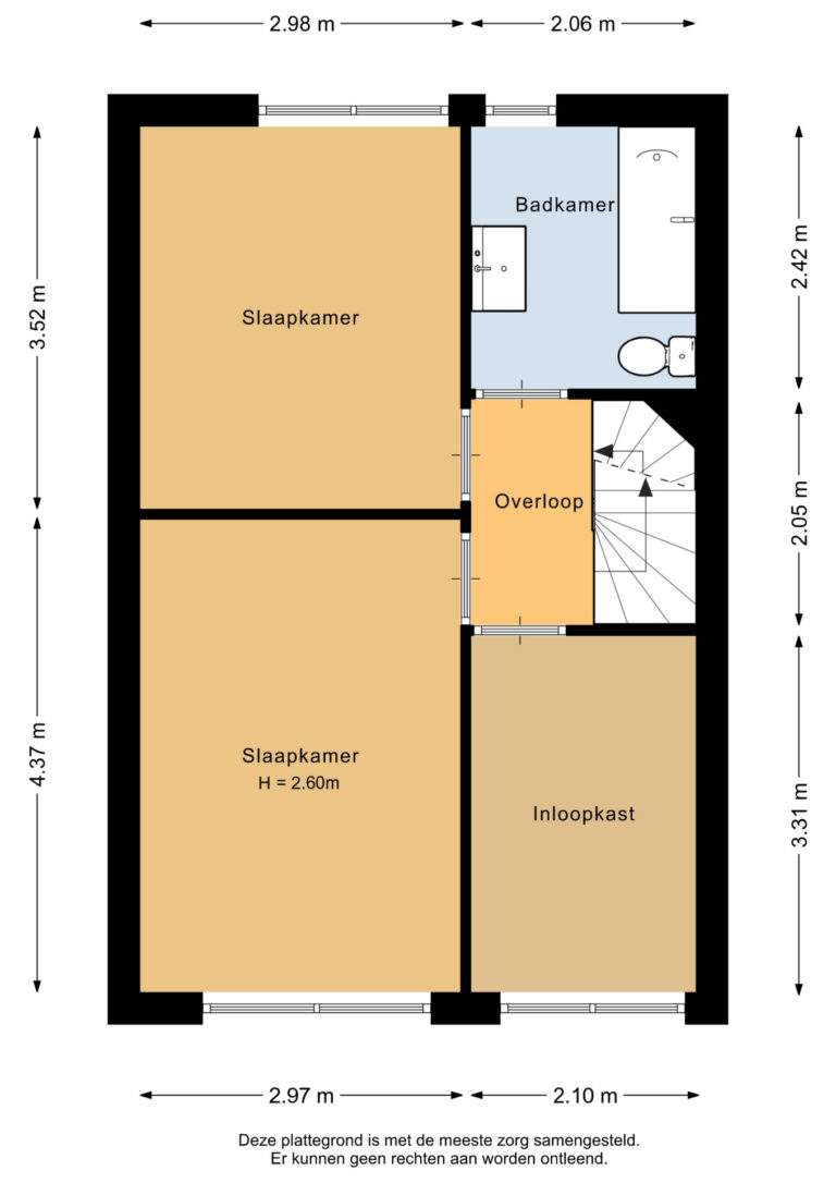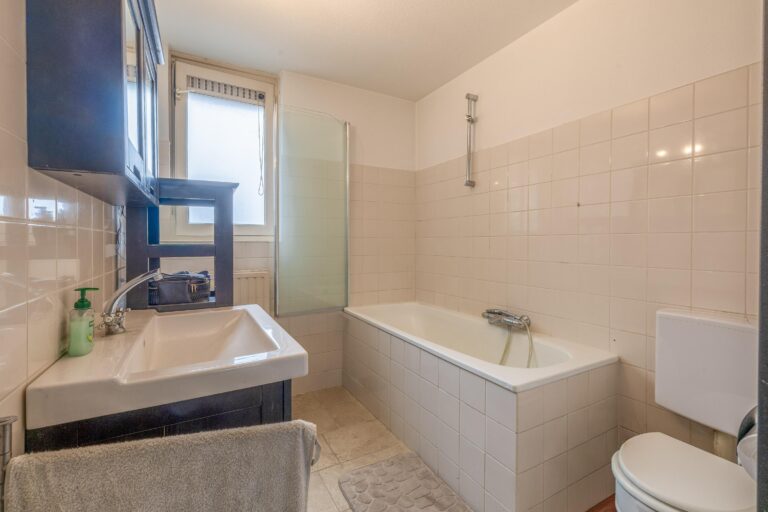 De overloop geeft toegang tot drie slaapkamers, alle voorzien van een laminaatvloer. De badkamer is deels betegeld en beschikt over een ligbad, wastafelmeubel, toilet en een aansluiting voor de wasmachine.