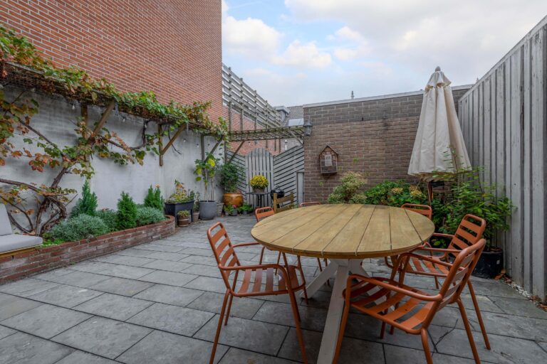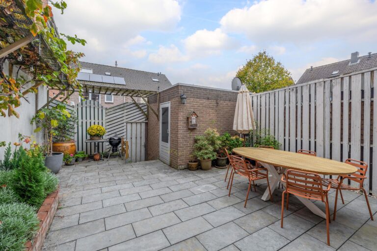 De achtertuin is sfeervol aangelegd, volledig omheind en voorzien van een berging en vrije achterom, een heerlijke plek om te ontspannen of gezellig te barbecueën met familie en vrienden.