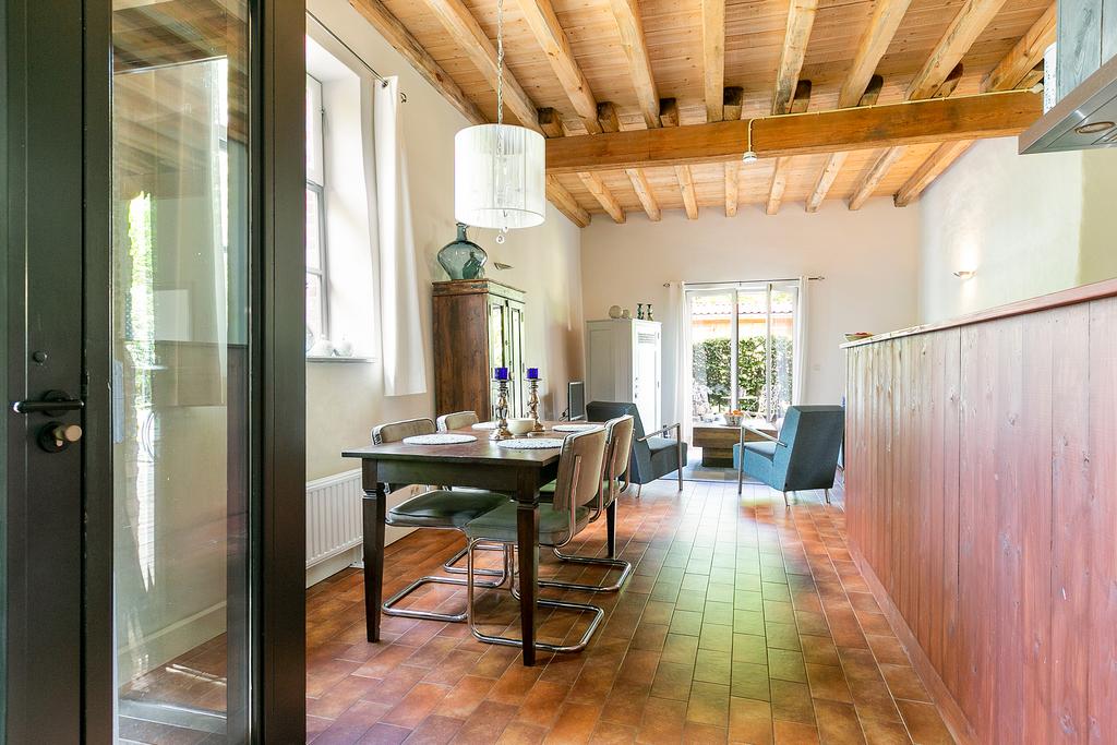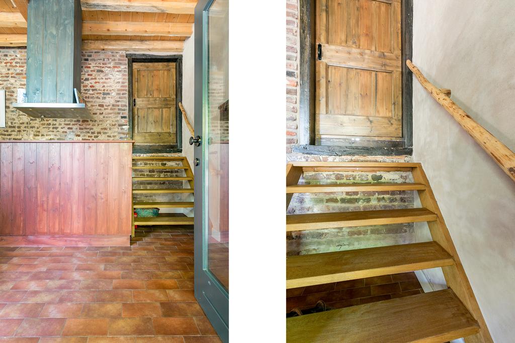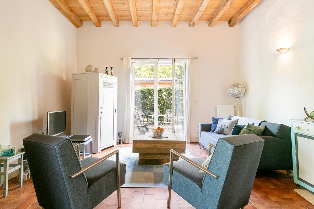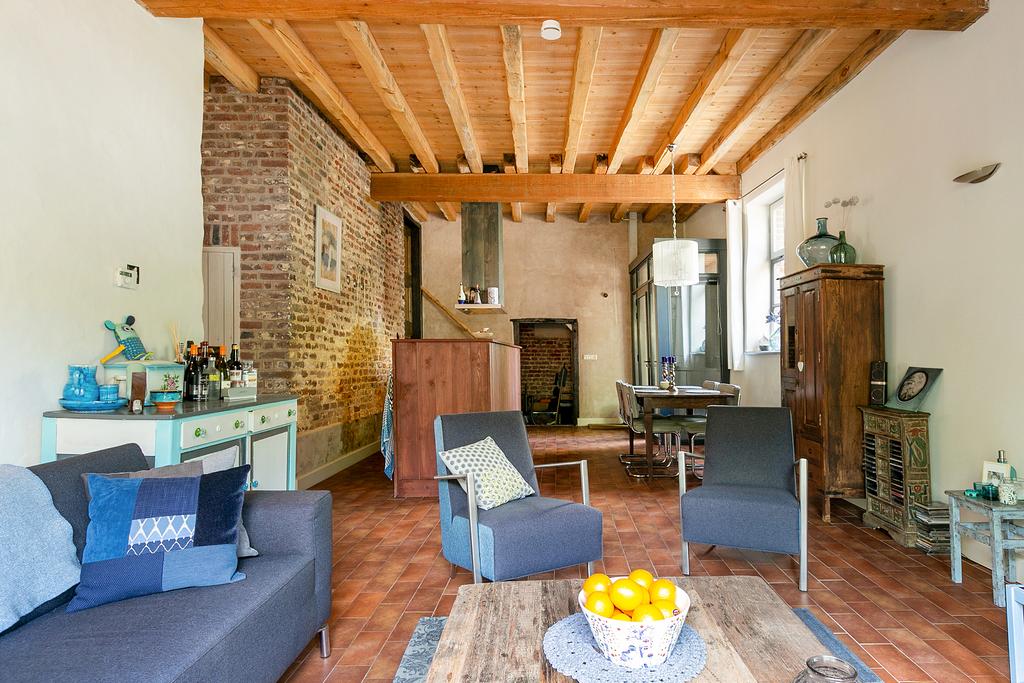 Entree, ruime woonkamer met open keuken voorzien van een roodbruine tegelvloer met vloerverwarming en openslaande deuren naar het terras en (deels gemeenschappelijke) tuin. In de tuin is een houten berging aanwezig. Aan de straatzijde is een parkeerplaats beschikbaar, behorend bij deze woning. De woonkamer kenmerkt zich door de hoogte van ca. 3.30 m met stoer houten balkenplafond, de bakstenen inbouw van de oude kelder met opkamer en de overige wit gestukadoorde wanden.